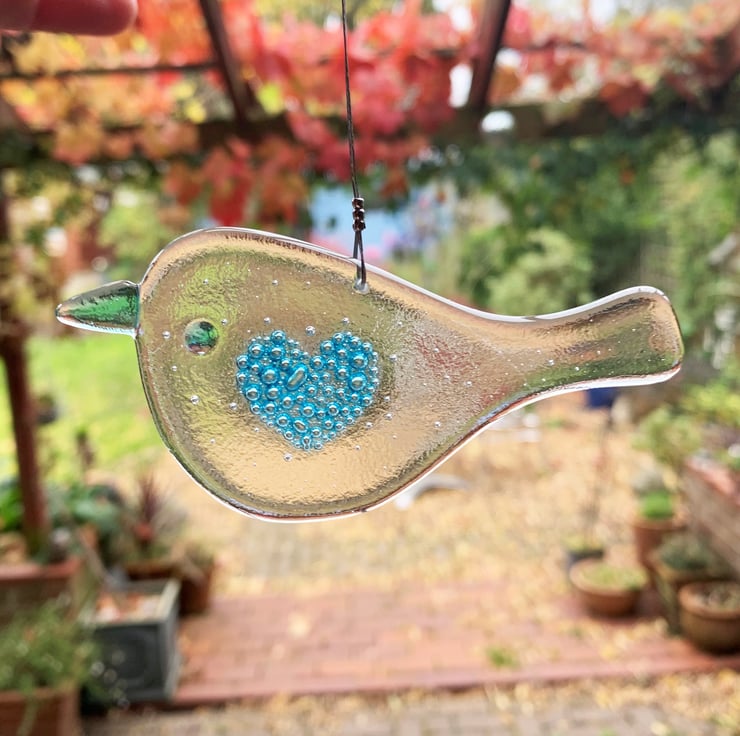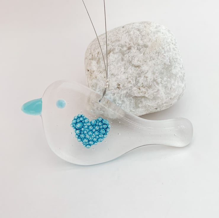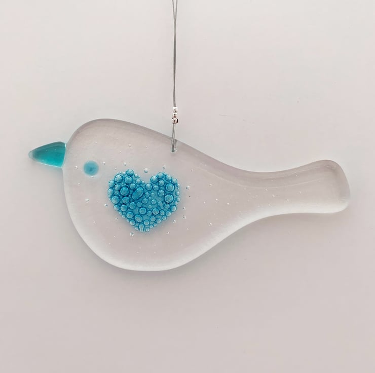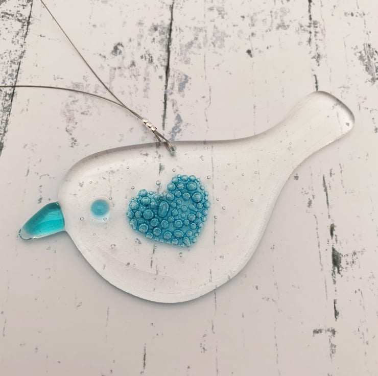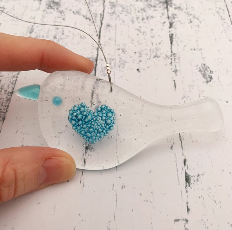 Fused glass hanging bird. Transparent glass with turquoise bubbles captured inside. Each heart is handpainted, therefore no 2 are exactly the same. One Supplied.