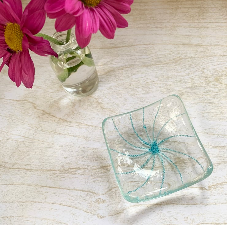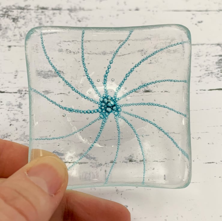To make this dish, I handcut 2 squares of art glass and hand paint a delicate swirl design with specialist glass paint onto one of the squares. I then cap it with the other square and fire it overnight in my kiln. In the heat of the kiln, the specialist paint turns into turquoise bubbles trapped between 2 layers of glass. I then fire the piece a second time to slowly slump it into a ceramic mould. Transparent glass is handcut and assembled, and the swirl is handpainted therefore no 2 are exactly the same. One Supplied.