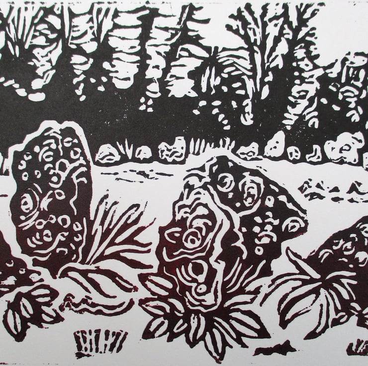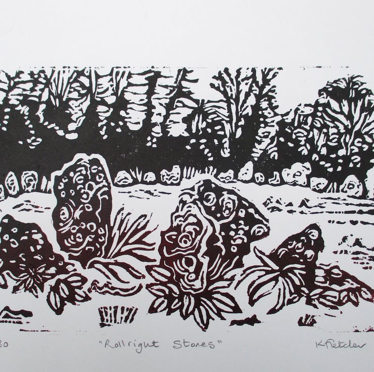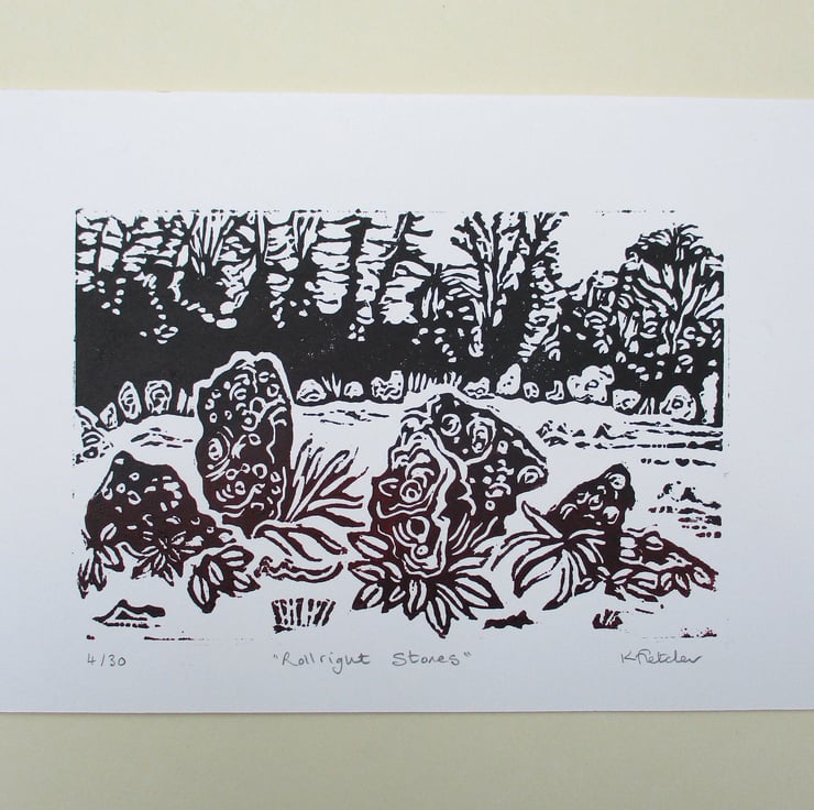 This is an original hand pressed linocut print of the Neolithic stone circle which lies on the Warwickshire/Oxfordshire border known as the Rollright Stones. It is based on photographs I took some years ago during a summer visit.