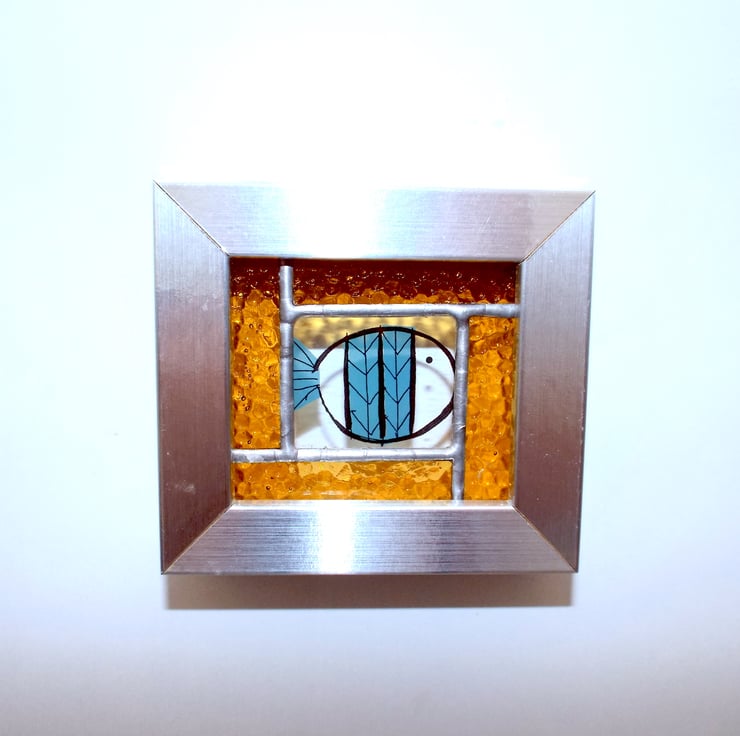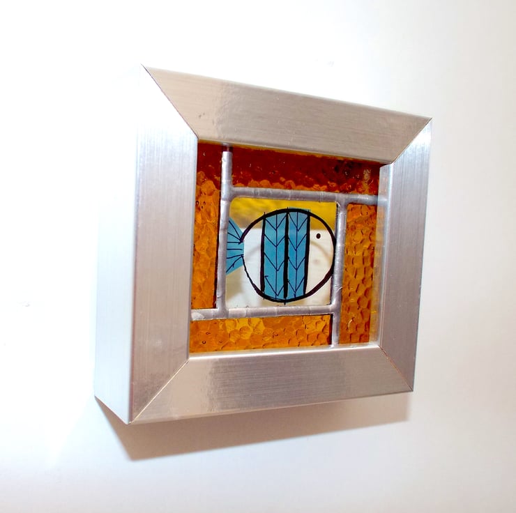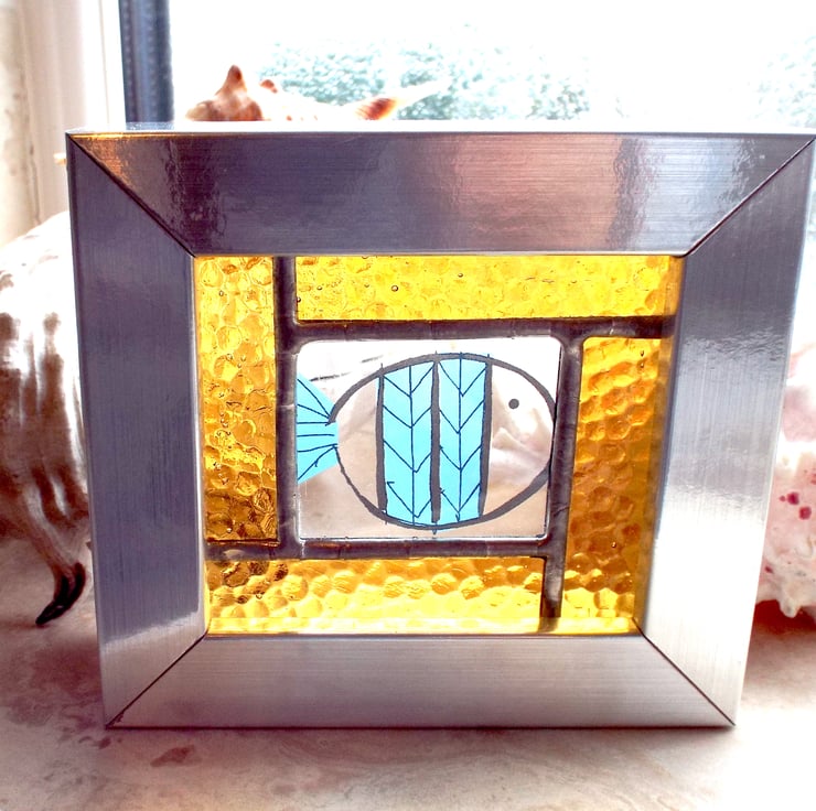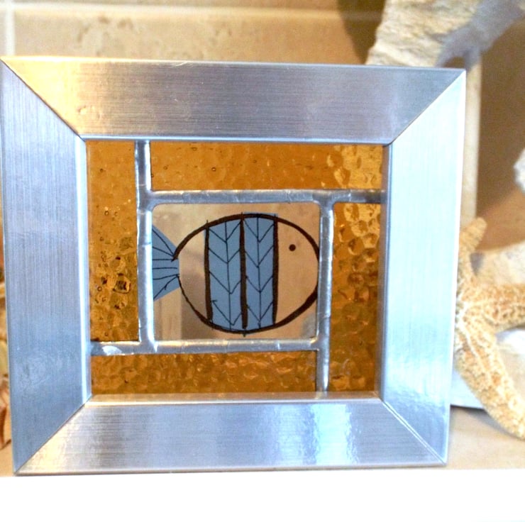 A beautiful stained glass panel depicting a little fish, made using the Tiffany (copper foiled) method of stained glass. This panel features a blue striped fish decal at the centre, inside a 4-piece, yellow hammered glass border. The entire panel is set into a free-standing silver frame.