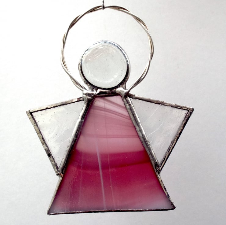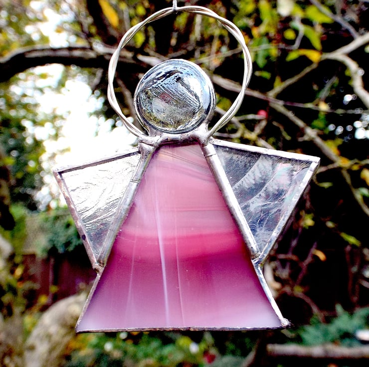 A beautiful stained glass angel made using the Tiffany (copper foiled) method of stained glass. She has a beautiful dress made of pink swirly glass and 2 wings in a patterned clear glass. Her head is a clear glass nugget surrounded by a twisted wire halo.
