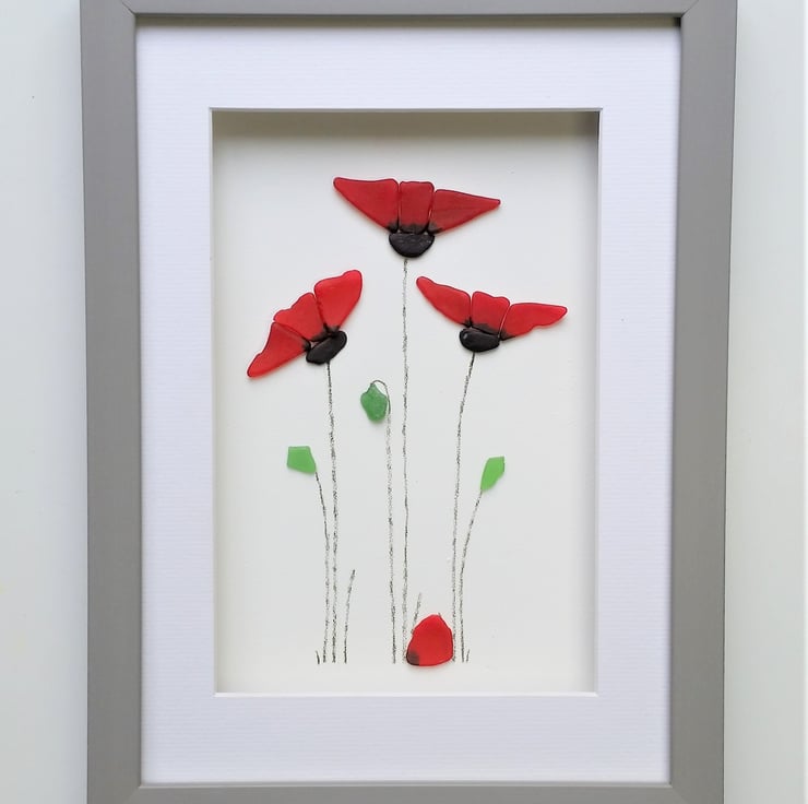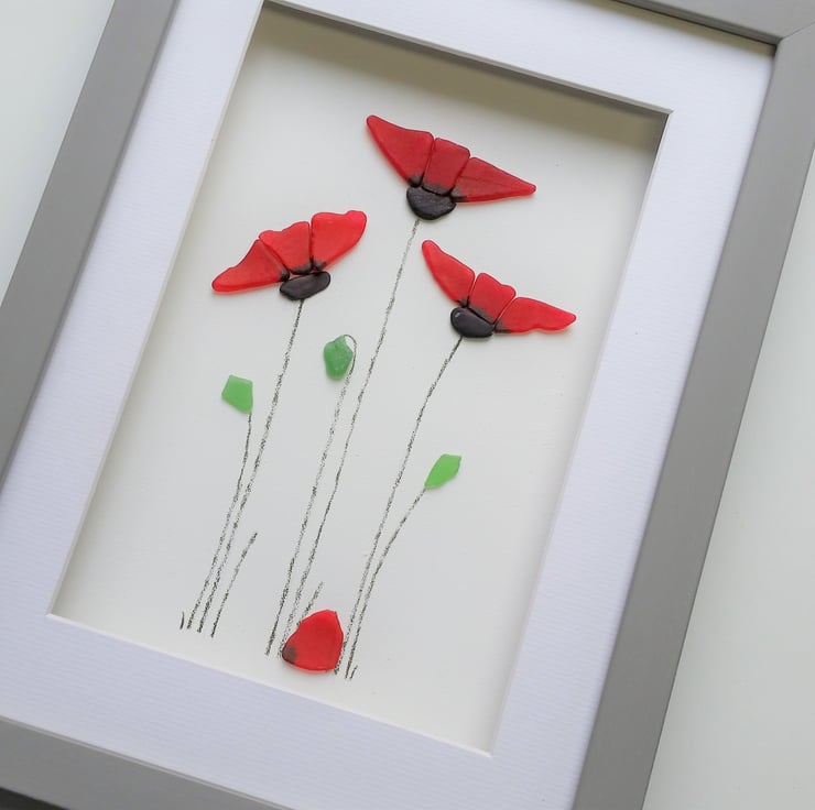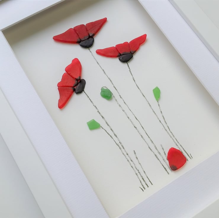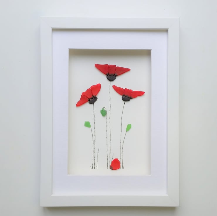 Poppies created from nuggets of beautiful ocean shaped and smoothed Cornish sea glass, picked up from the beach and coloured red by me, before setting them inside a 33cm x 24cm (22cm x 15cm aperture) glazed box frame that is all ready to hang on the wall.