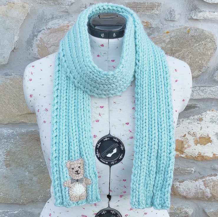 This scarf is beautifully soft, knitted in a chunky mixed yarn and decorated with crocheted teddy bears.