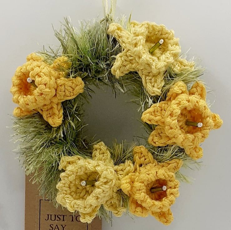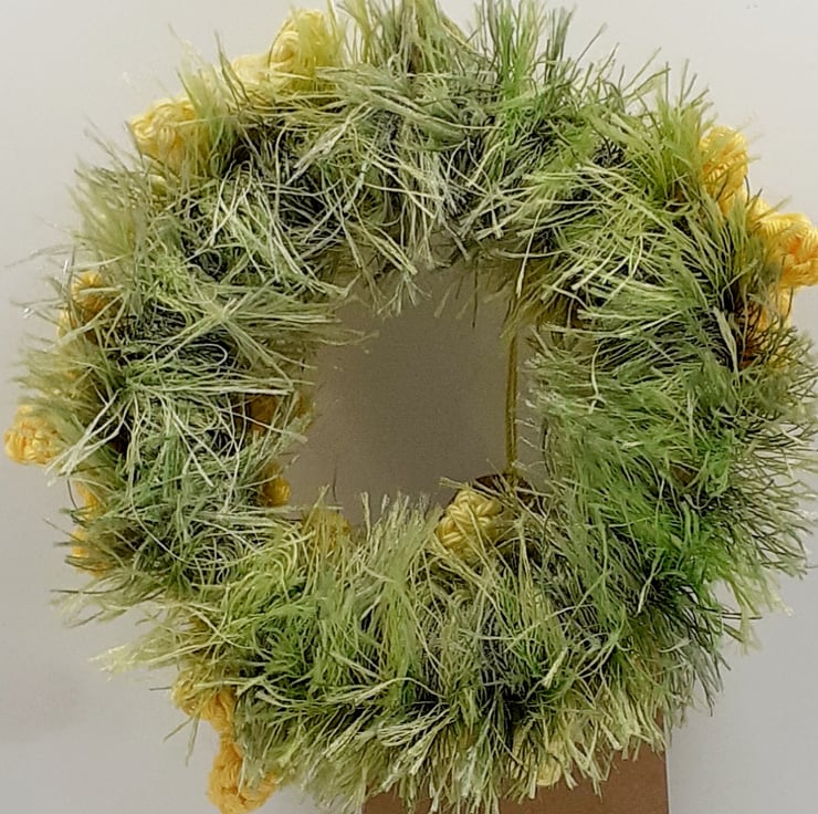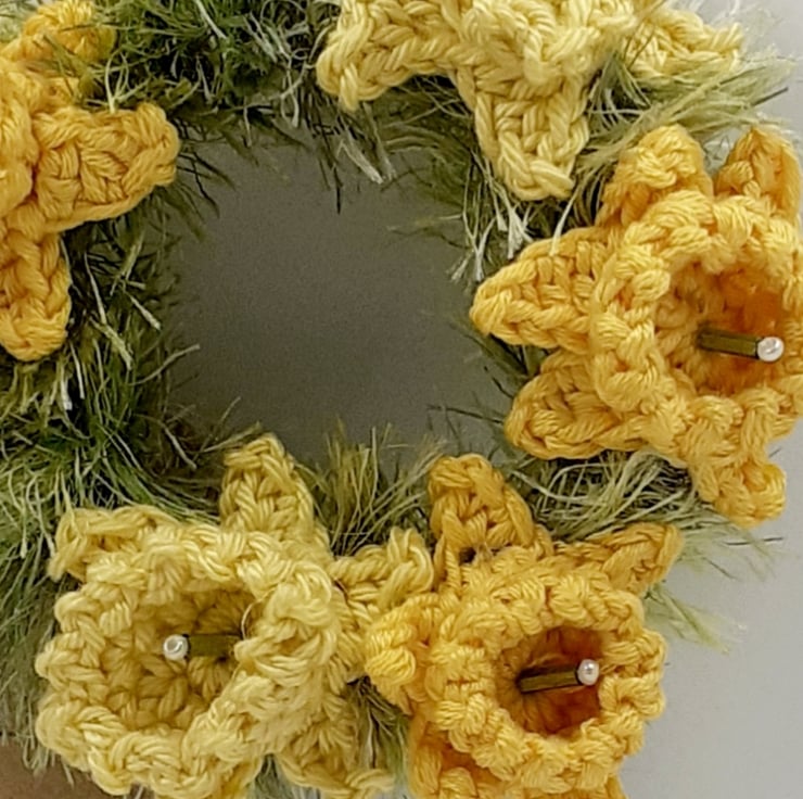 The wreath is made from a wooden ring which has been wrapped in eyelash yarn and decorated with daffodils crocheted from 100% cotton. The flowers each have a centre made from a green glass bugle bead and a tiny white seed bead. There is a narrow ribbon hanging loop.