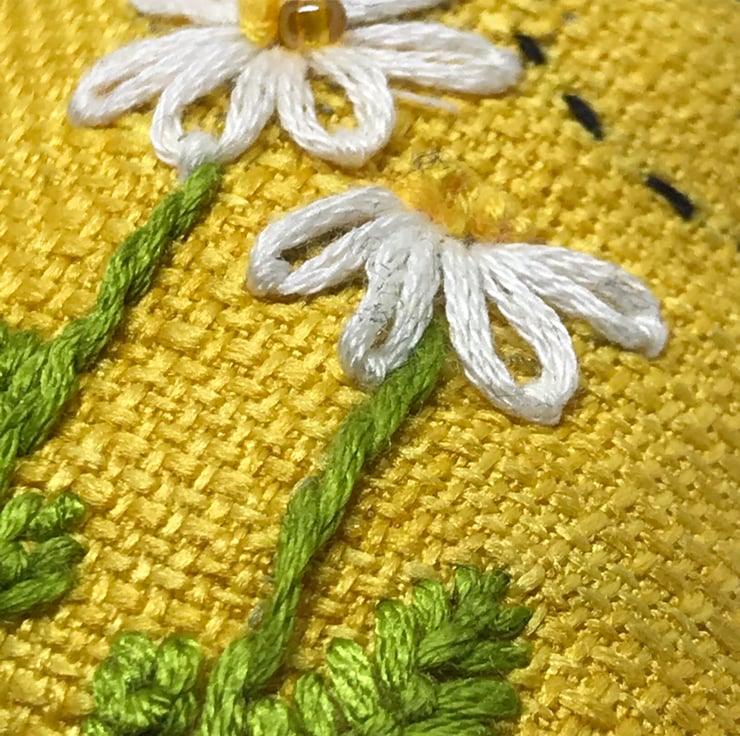 Clasp is a Bright Green Ball type silver metal type to match the daisy stems and clash with the Yellow Linen fabric. The clasp is sewn in using a matching yellow embroidery thread.