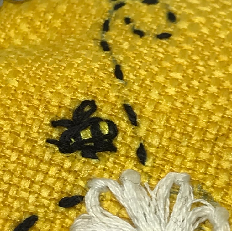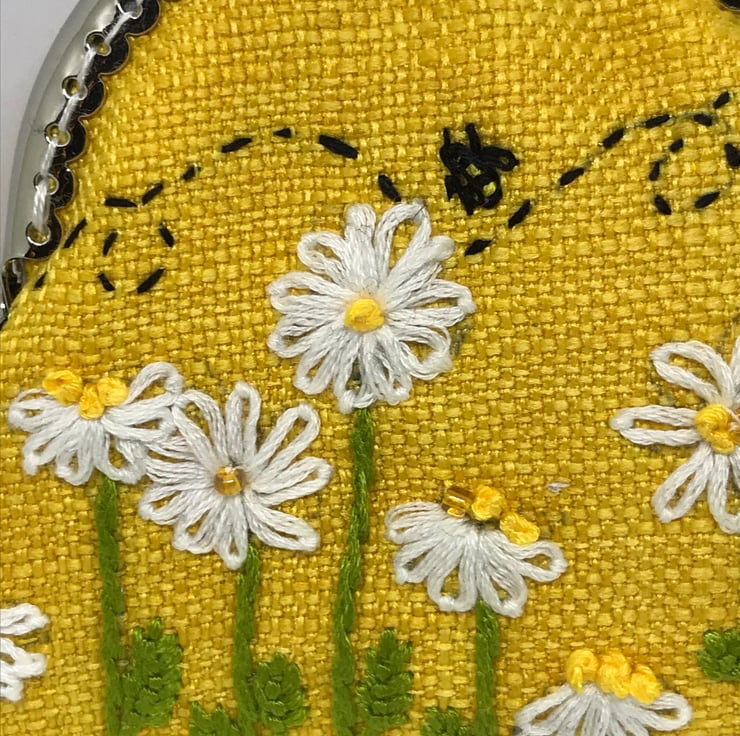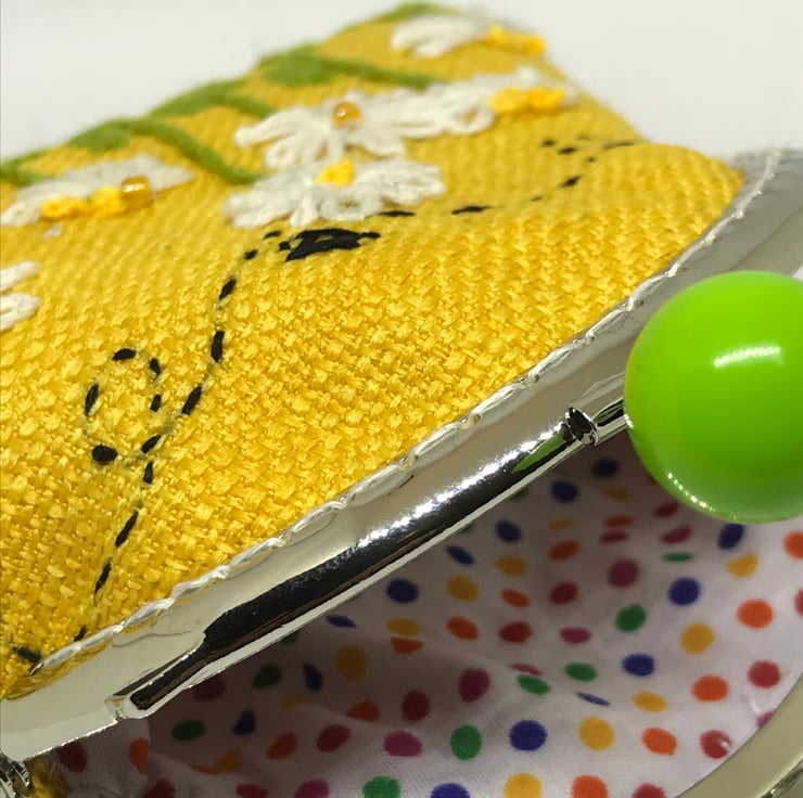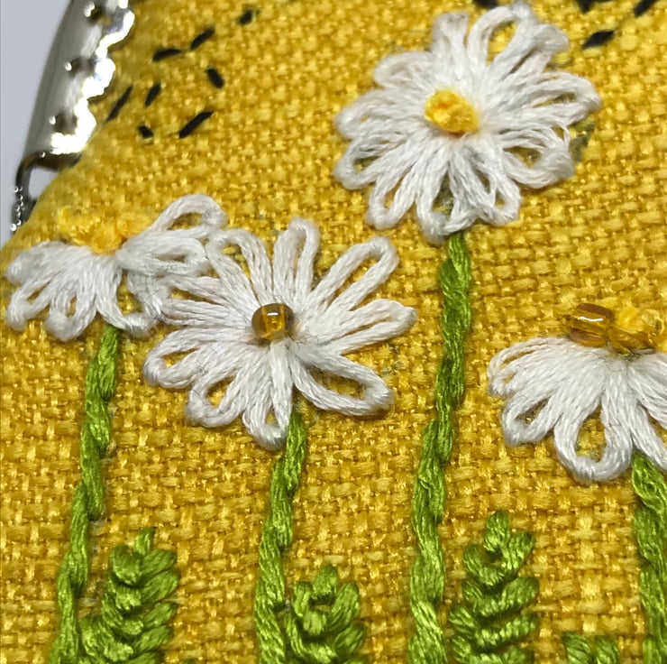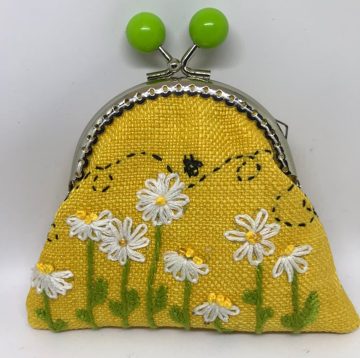 A bright and breezy Yellow linen Clasp coin purse, embroidered with a row of white daisies. Just look at the Bumble Bee being blown from flower to flower. There are a couple of yellow beads in the contre of the daisies just to give it a little bit of sparkle. Not to much as we dont want to frighten the Bee. The back of this purse is plain.