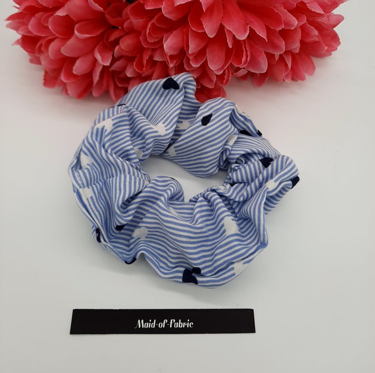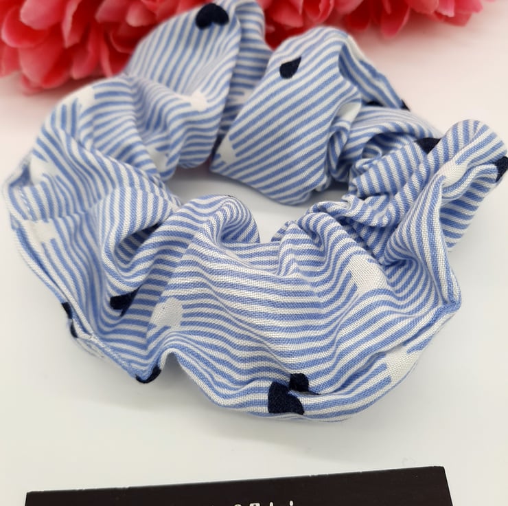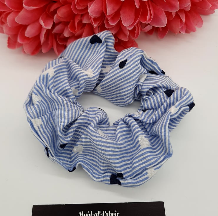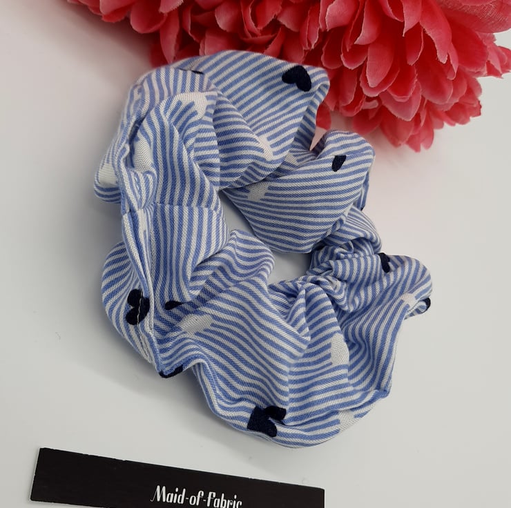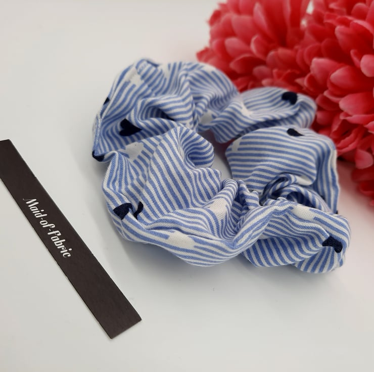 Scrunchie made using a soft touch blue and white stripe hearts pattern cotton.