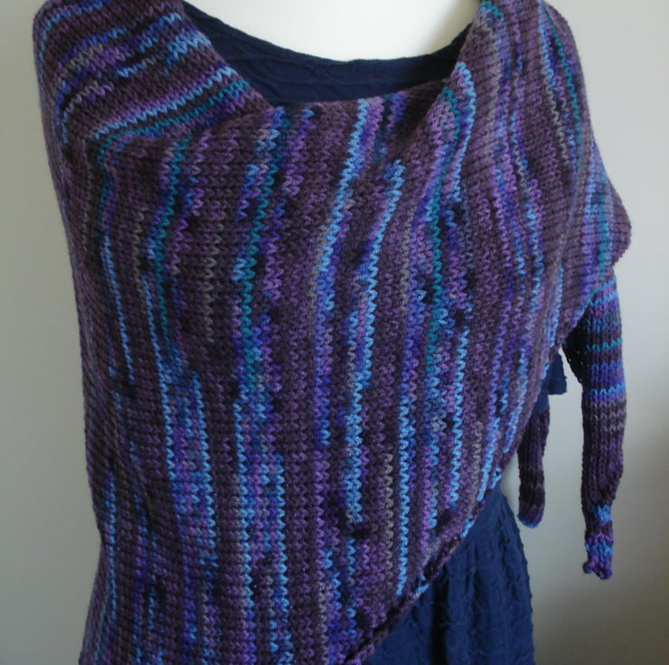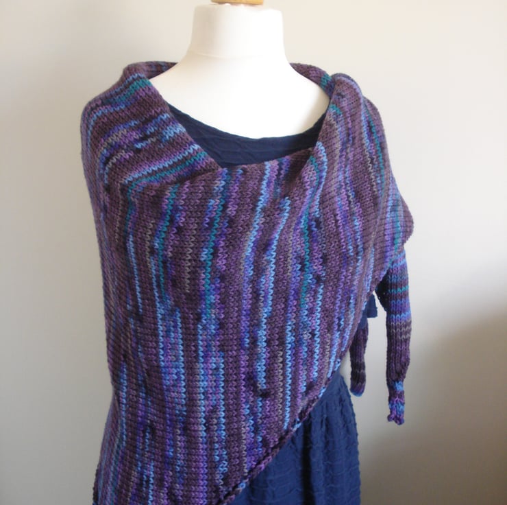 This triangular knitted wrap is beautifully soft and will make a much loved addition to your wardrobe or a wonderful gift. It features pretty eyelets along two sides for a decorative finish.