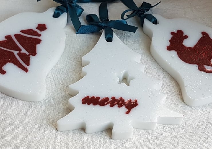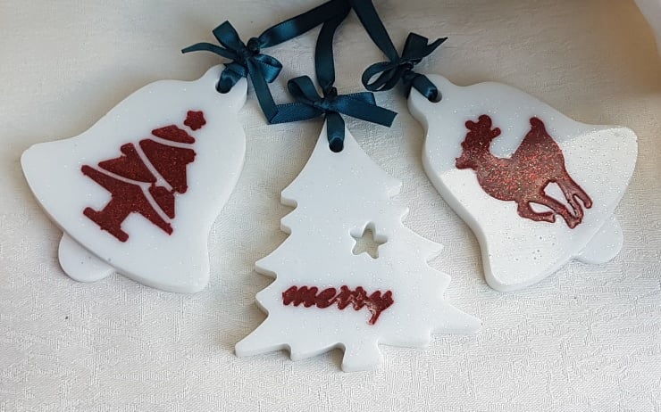 Gorgeous set of 3 Christmas decorations made of White and Red glittery resin. The set consists of two bell shapes with a Christmas tree and Reindeer on them and a Christmas Tree shape with the word Merry on it. Gorgeous to hang on your tree or as hanging decorations elsewhere. They come on a gorgeous Teal Satin ribbon with bows.