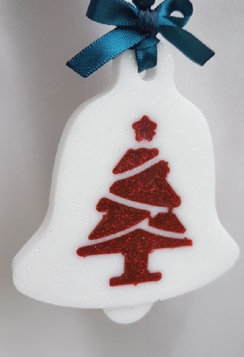Decoration sizes Bells are approx 9.5cm (H) x 7.5cm (W) x 1cm thick. Teal Satin Ribbon length is approx 8cm long and has a small bow. Tree decoration is approx 9cm (H) x 8.5cm (W). Bells and tree shapes are Glittery White Resin decorated with Glittery Red Resin Tree, Reindeer and Merry detail.