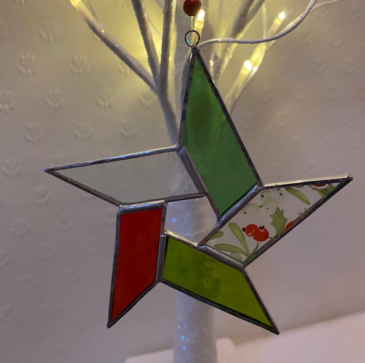 A beautiful stained glass Christmas Pentagon Star made using the Tiffany ( copper foiled ) method of stained glass . The star is made using 5 pieces of glass ( red , green , clear and Christmas decal) It has a bead on a nylon hanging thread.
