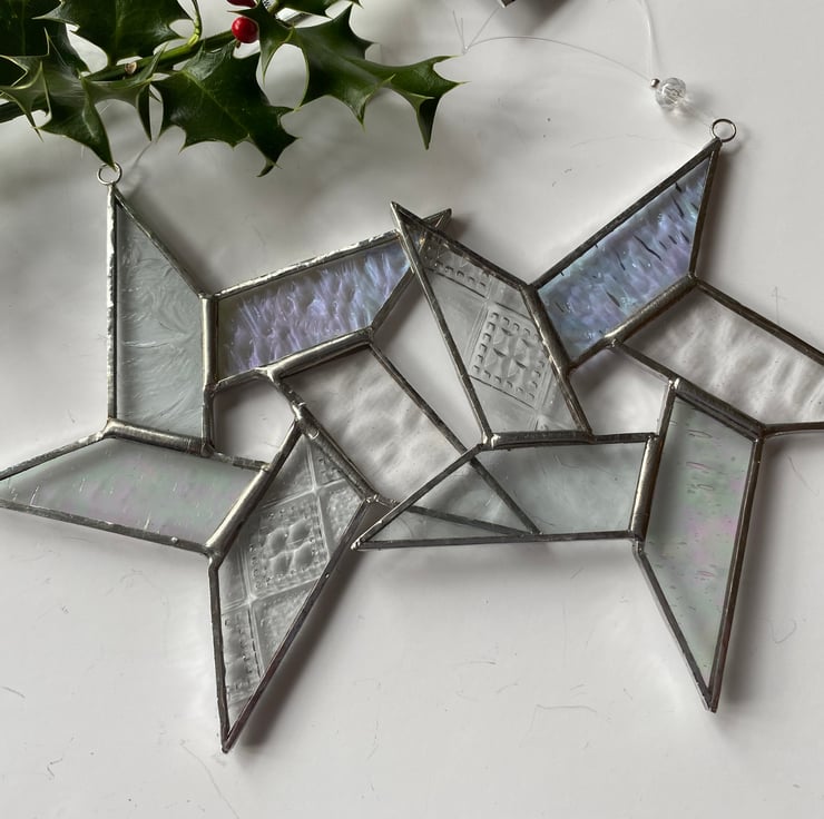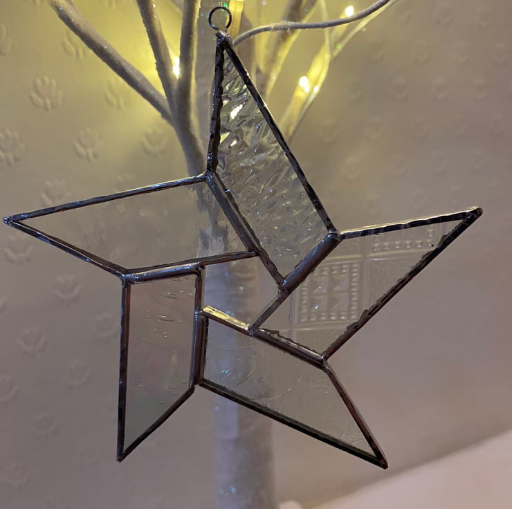 A beautiful stained glass Christmas Pentagon Star made using the Tiffany ( copper foiled ) method of stained glass . The star is made using 5 pieces of Clear glass with different textures and some are iridescent. It has a clear bead on a nylon hanging thread.