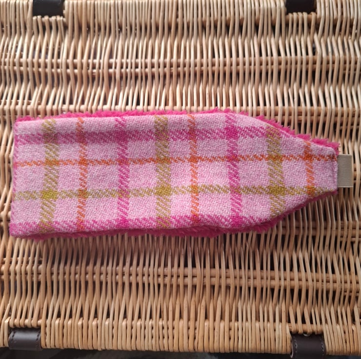 These fun earwarmers are made from a pretty pink, orange and green check Harris Tweed and vanilla cream thick fluffy fleece.