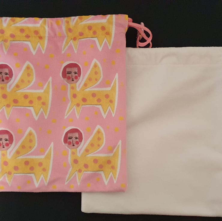 The back of the wash bag is white, unprinted velvet, with a waterproof lining inside.