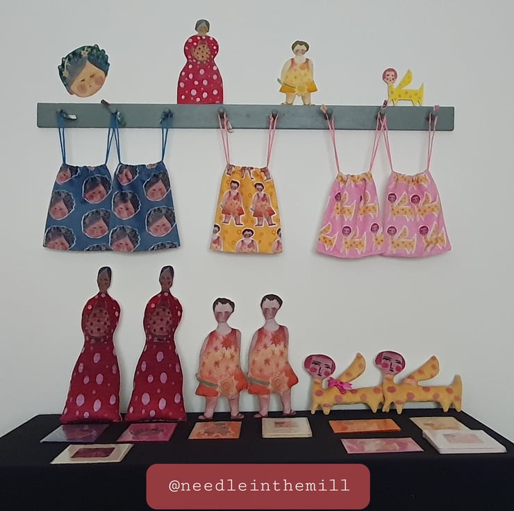 My job was to get the fabric printed and make the products. These included aprons, totes, wash bags, dolls and cards.