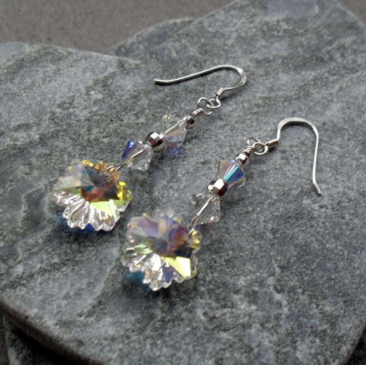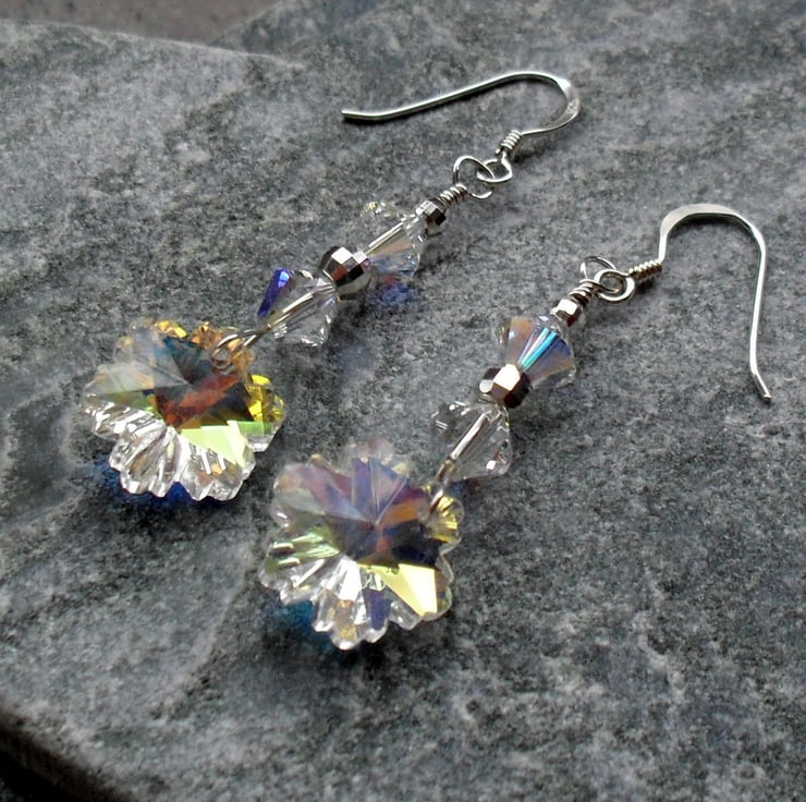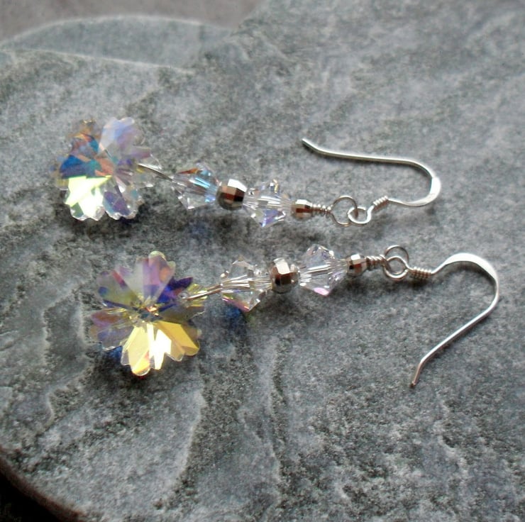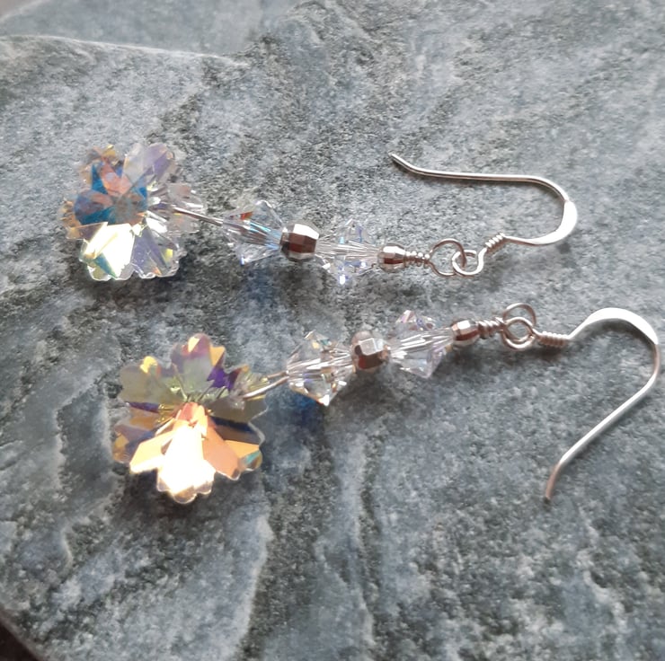 Swarovski® crystal snowflake and bi cone shaped beads which have plenty of sparkle are attached to sterling silver ear wires.