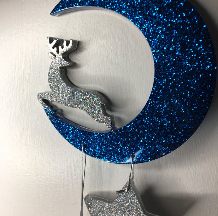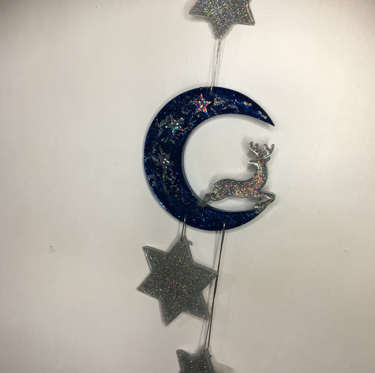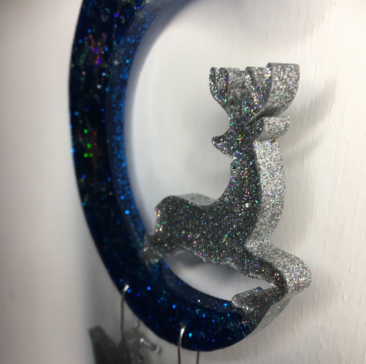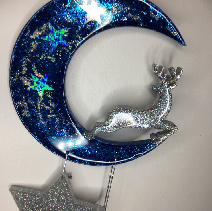 Resin Crescent, reindeer, stars, sparkly, blue, holographic silver, wall hanging
