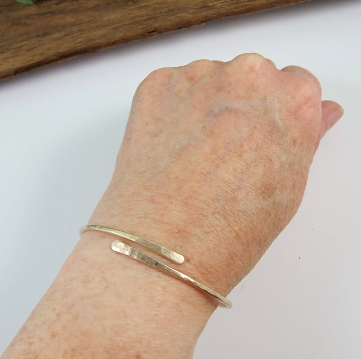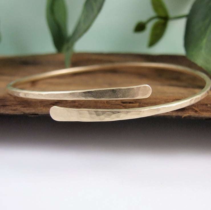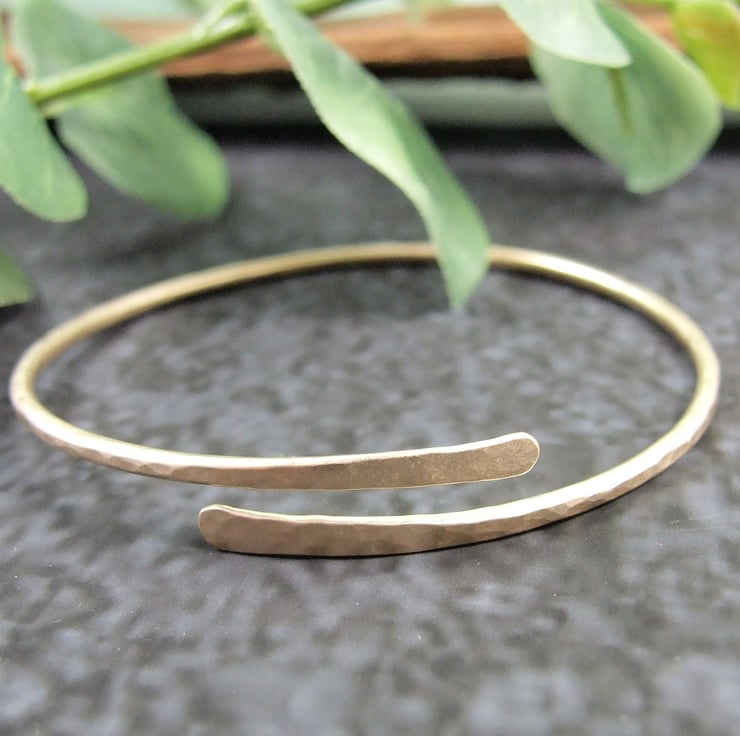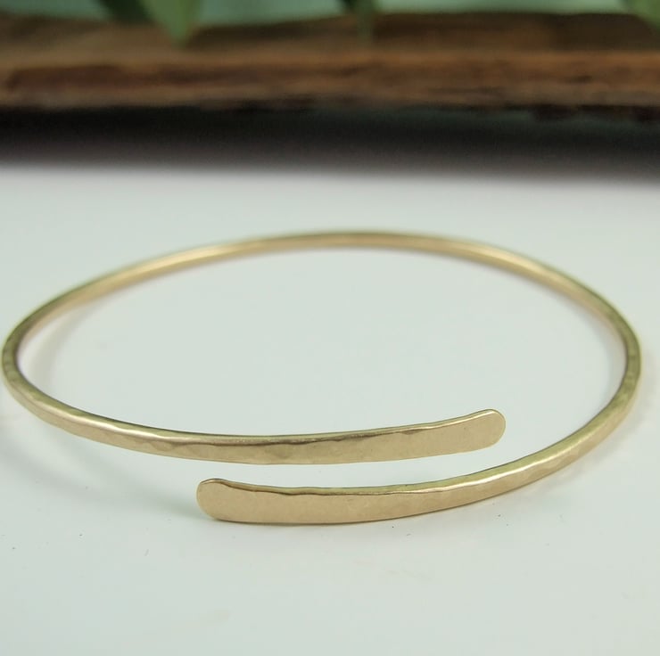 I have made the bangle from 2mm wide 14ct Gold Filled wire in an overlap wrap design which I have slightly flattened at each end into a paddle shape. The finish pattern has been created with a hammer and then given a satin finish. Bangle circumference is 7.5 inches but this can be adjusted slightly to suit.
