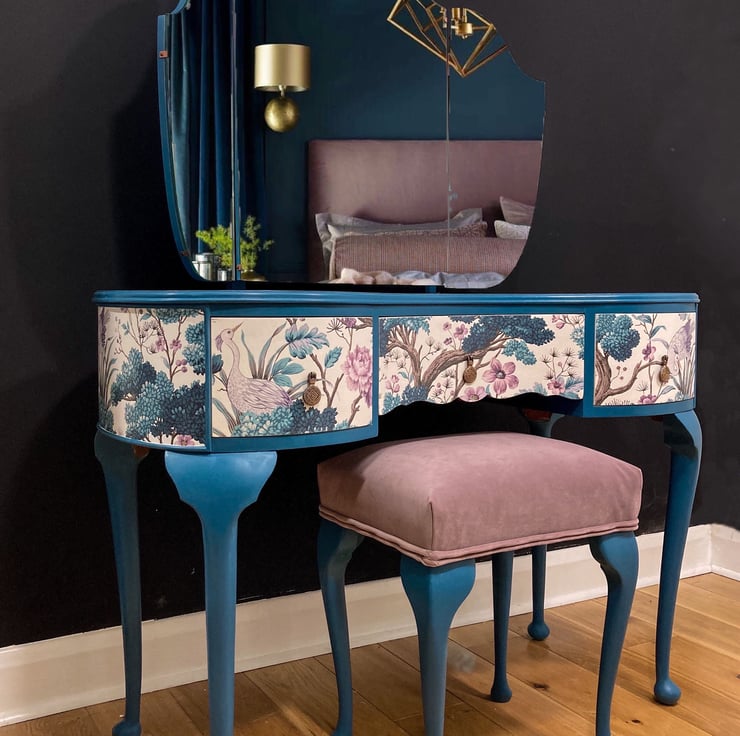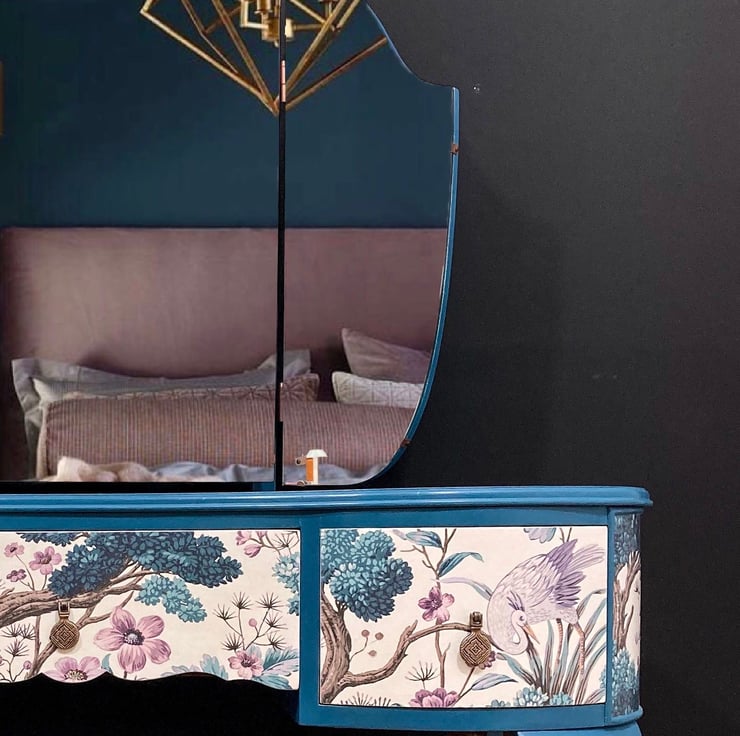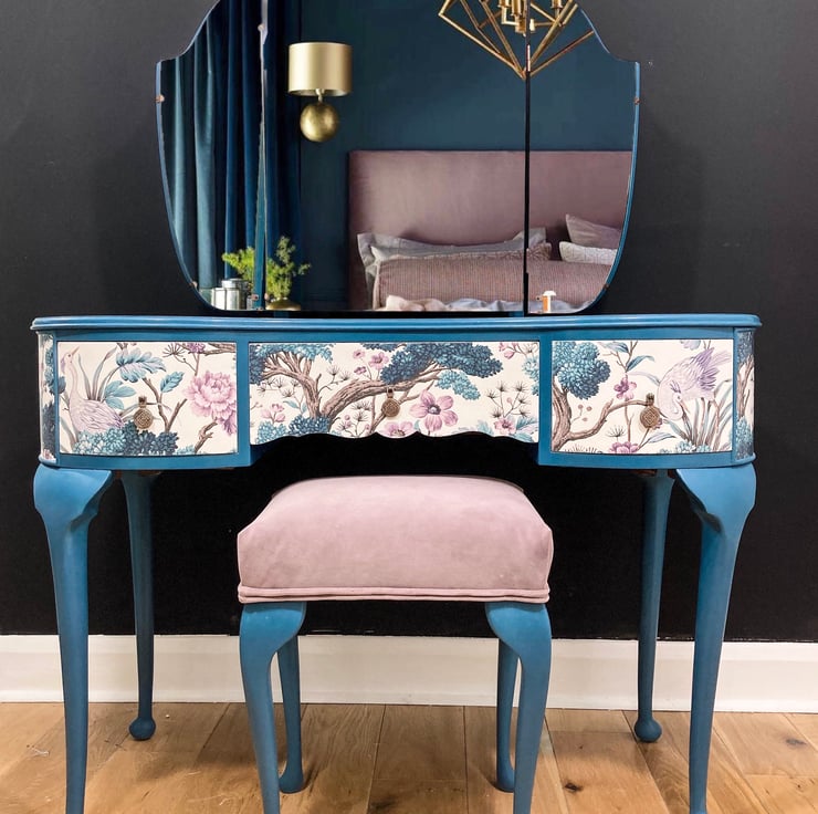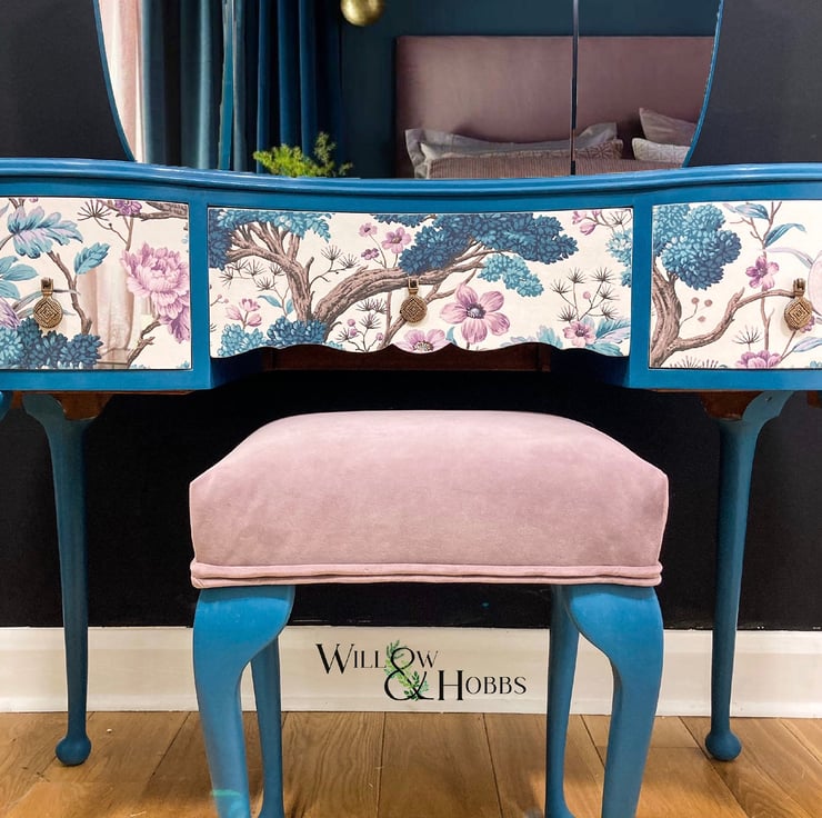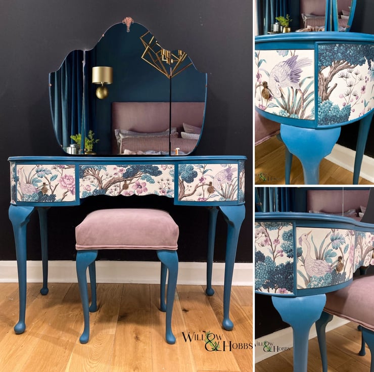 The colour is a custom mix, so completely bespoke. The drawer design is a beautiful Woodchip and Magnolia creation, decoupaged to add a stunning finish. With a beautiful triple mirror and custom made stool this dressing table is a stunning statement piece.