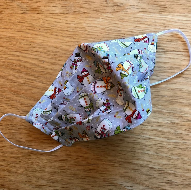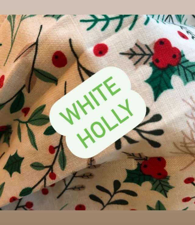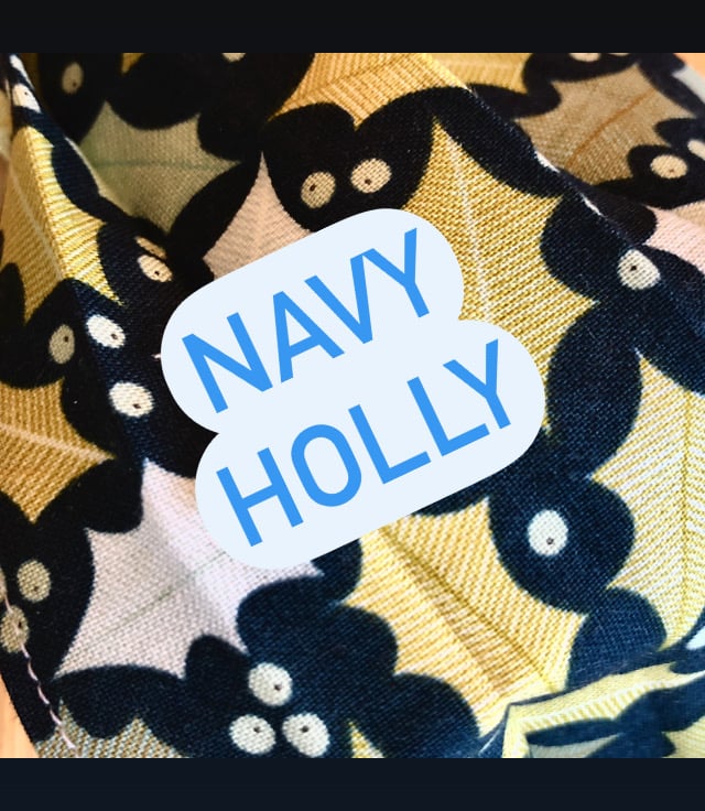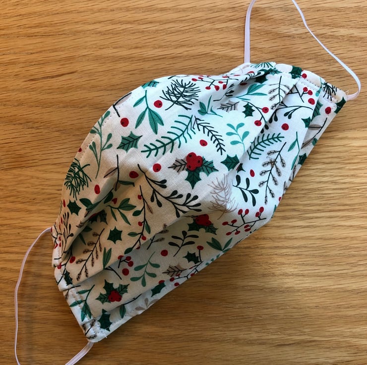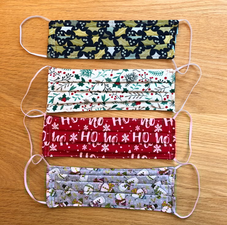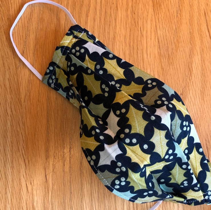 Triple layer Festive cotton face coverings made from two layers of jolly cotton with non-woven interfacing in the middle. The mask is supplied with a contrasting lining and elastic round the ears.