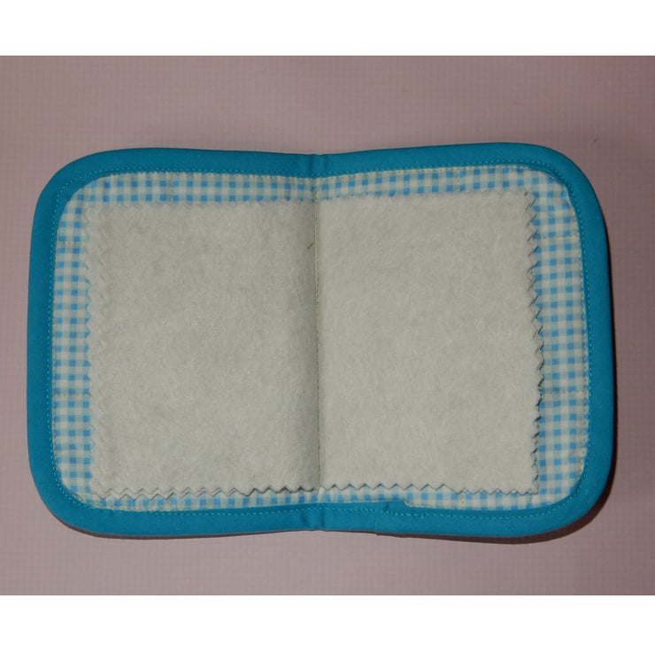 Useful items can be pretty too, and this faux patchwork needle case is just the thing, it measures approx. 5.5 x4 inches. It is lined in a toning fabric, with a turquoise binding and has four felt leaves for your pins and needles. There is a layer of wadding for added body. An ideal present for the needlewoman, and would be a great present for anyone keen on sewing or for those essential repairs in any household.