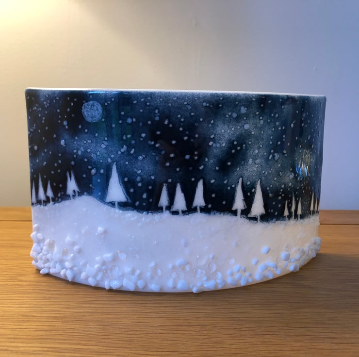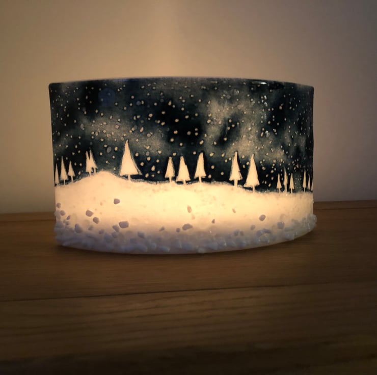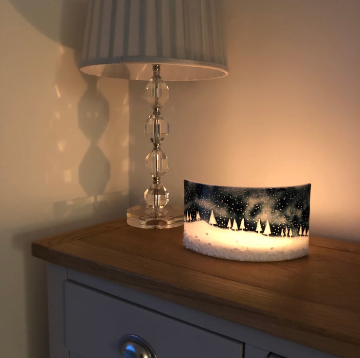 A beautiful curved glass depicting a winters snowy scene, which is beautifully and subtly illuminated with a tea light behind. Measure 24 x 12cm. This item is made to order and so is unique and may vary slightly from the photograph. Please allow 14 days to dispatch. (The lamp in the photo isn’t included!) :-)