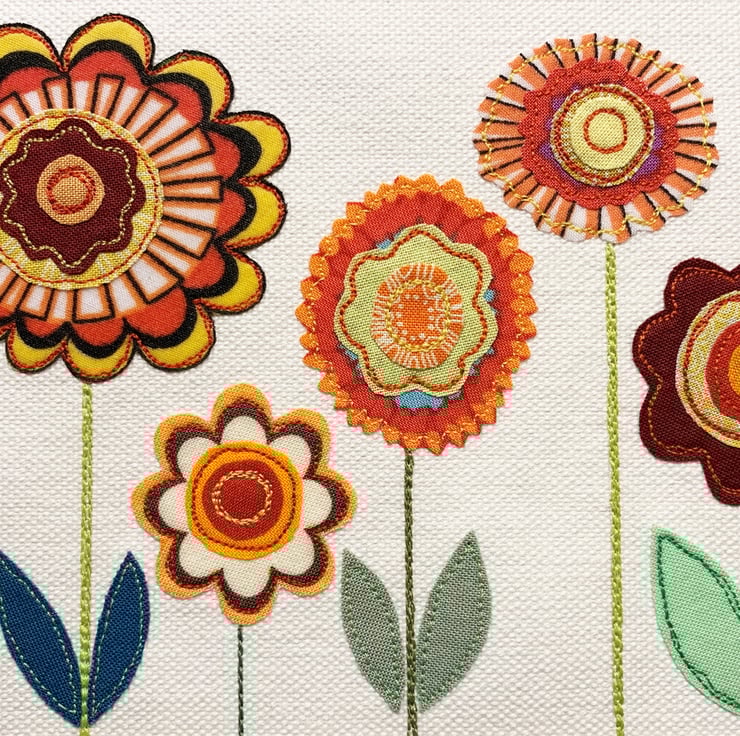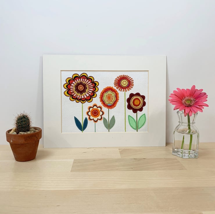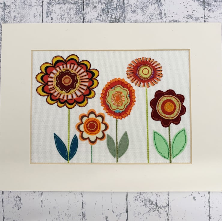 Appliquéd funky flowers in tones of ochre, orange and reds. I select complementary fabrics and threads and then appliqué them to sturdy artists canvas. I love to use retro floral fabric if I can (I have a rather large collection of retro fabric!) Every composition is individual. Comes mounted in a sturdy white mount, which can be propped up on a shelf or you can add a frame of your choice. It will fit in a standard Ikea Ribba frame.
