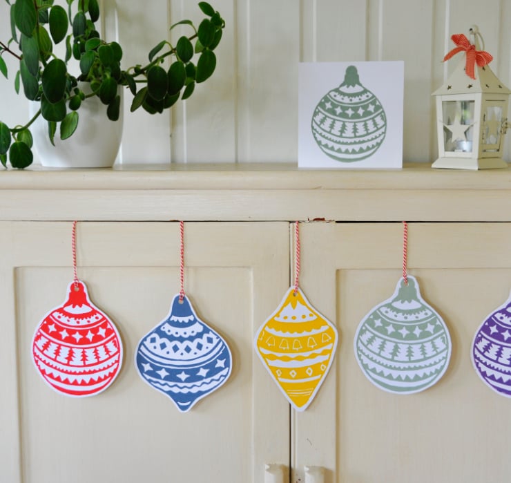 An unusual Lino printed Christmas Bauble which can be sent as a card or hung by the striped cord as a decoration. Handprinted using water soluble printing ink and mounted on acid free card cut into the shapes pictured.