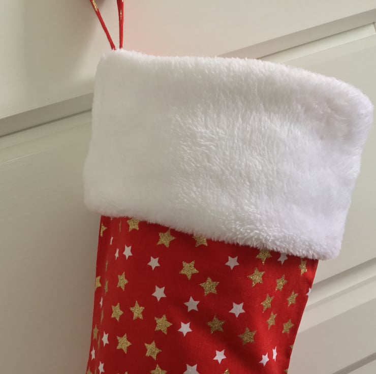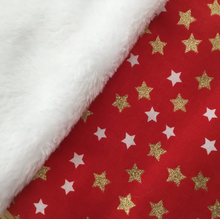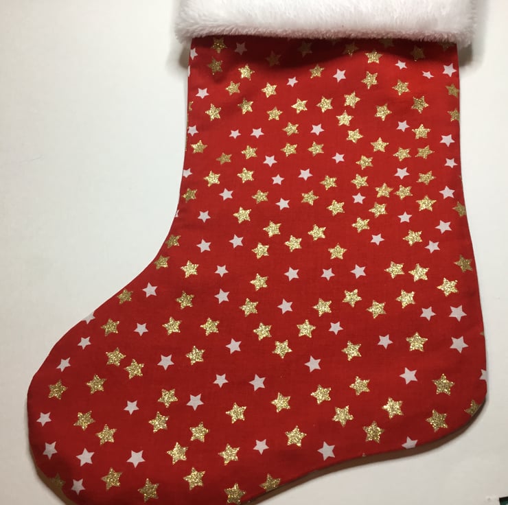 Christmas Stocking with fur cuff and glittery star fabric, lined in a Father Christmas red satin with a 3.5” hanging loop. Opening is approximately 6.5” diameter and length of stocking from top to toe is approximately 15.5”