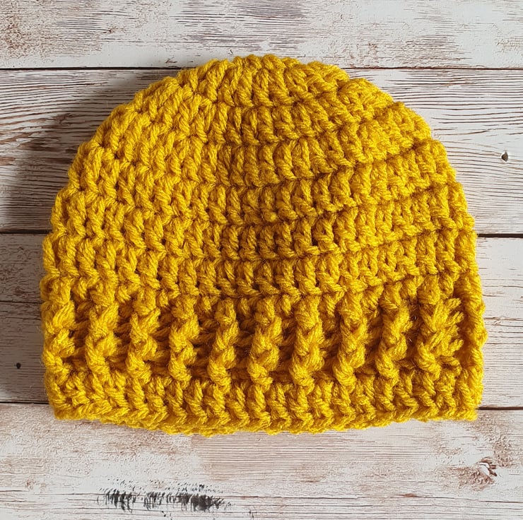 Lovely baby beanie hat in a fresh yellow with a white stripe.