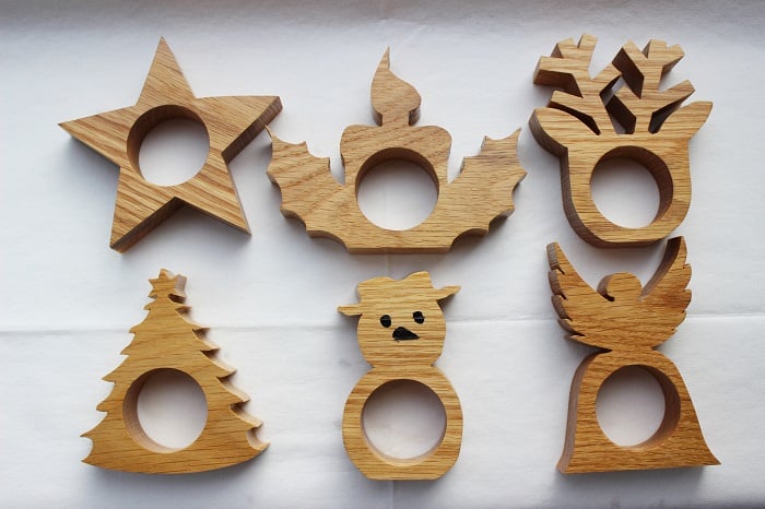 A set of six handmade Christmas napkin holders, each in a different festive style providing a unique and fun look to your Christmas table. Set includes - Star, Candle, Reindeer, Christmas tree, Snowman and Angel.