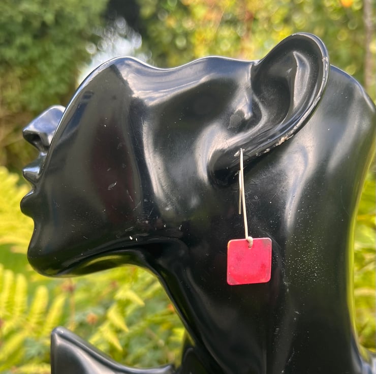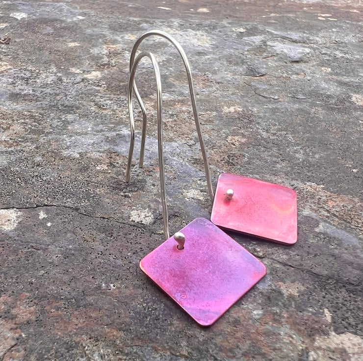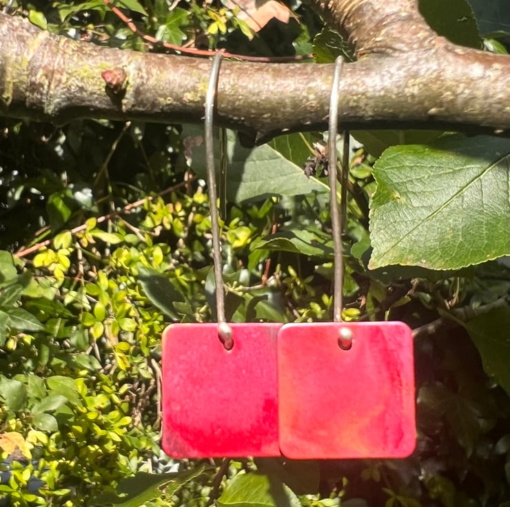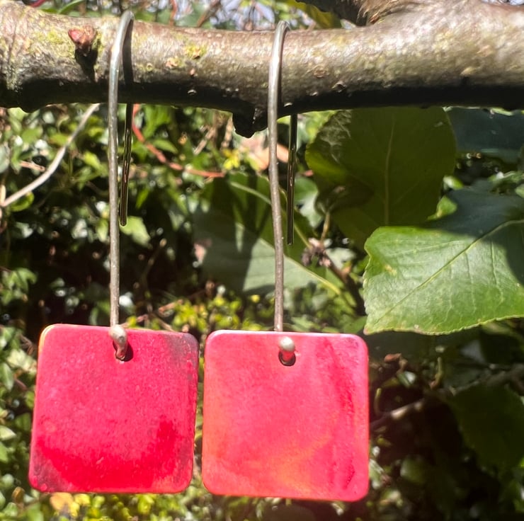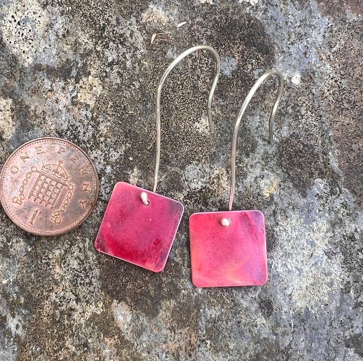 Geometric red square dangle earrings; simple but making a statement . The different Autumnal tones of red, dark red and purple have been created using heat on raw copper. The colours are preserved with a penetrating wax preservative. The 15mm diameter squares hang from long handmade sterling silver ear hooks and the total dangle is 42mm/ nearly 1.75 inches.
