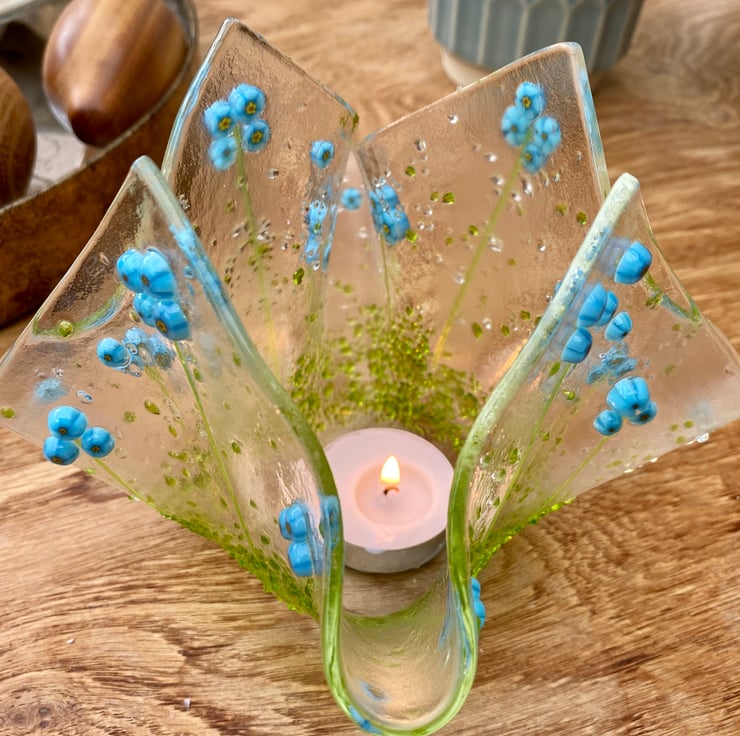 Dotted with beautiful blue forget-me-nots, this draped candle holder looks lovely with or without a candle.