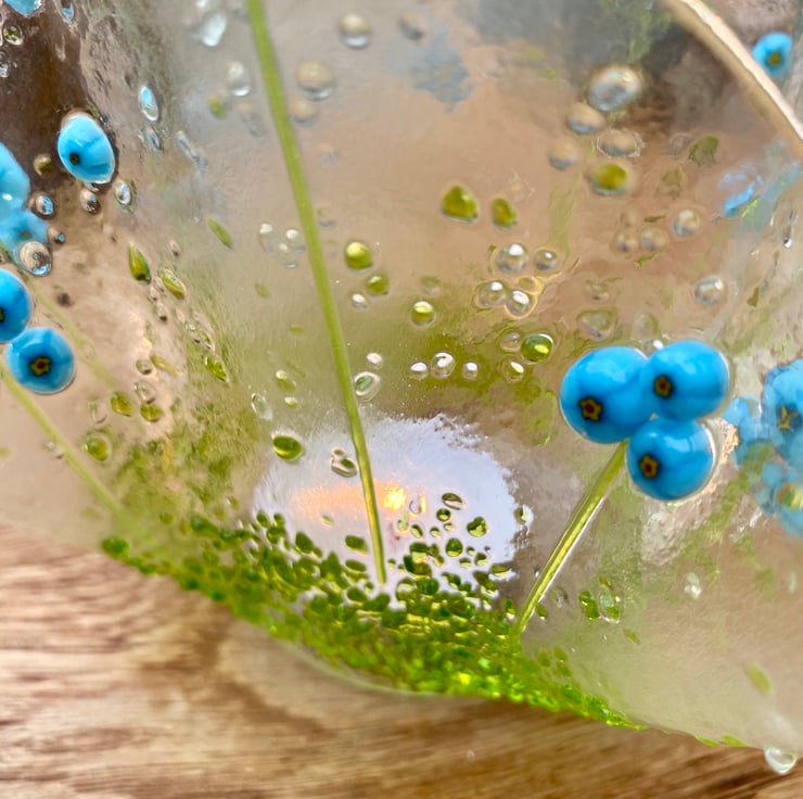 Measuring approximately 17cm across and 12cm high, the flowers and other decorative elements have been fused to clear glass before a second fusing to slump the piece over a mould to get the draped appearance.