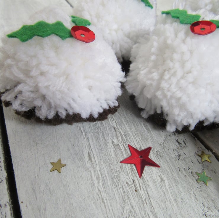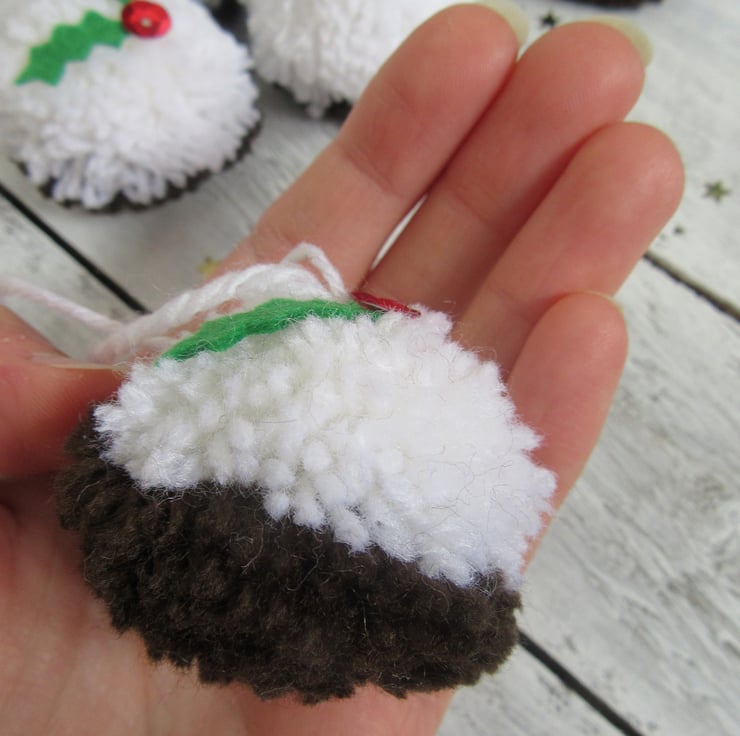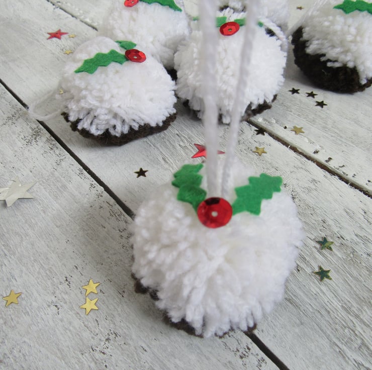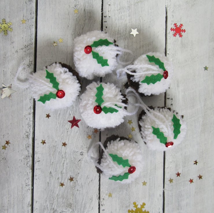 Set of six fun and woolly Christmas pudding pompom tree decorations.