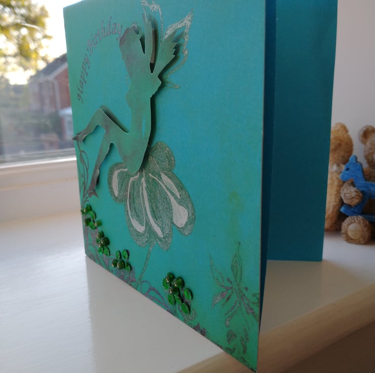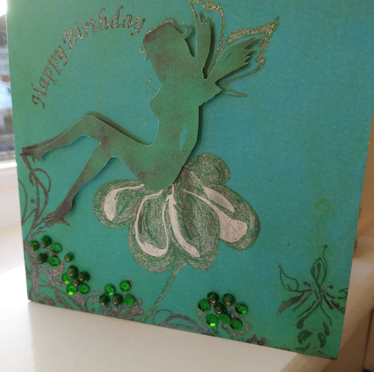A completely handmade and uniquely designed card. Consisting of a delicate fairy reclining on a flower decoupage on jade floral card. Happy birthday hand written in black glitternink. Embellished with green sequins and beads.