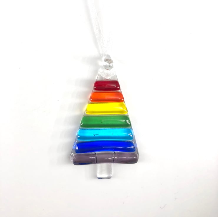 The tree has a sparkly silver dichroic bead fused to the top and the trunk is made from shimmery iridescent clear Glass. The piece measures approx. 4 x 6cm and comes on a length of white organza for hanging.