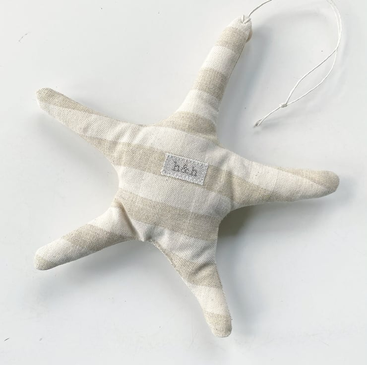 Made of sand and cream checked cotto, filled with fragrant lavender (and a little toy stuffing to add extra shape), the starfish is finished with a tiny wooden button and a natural hemp twine hanging loop.