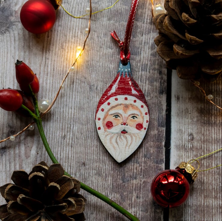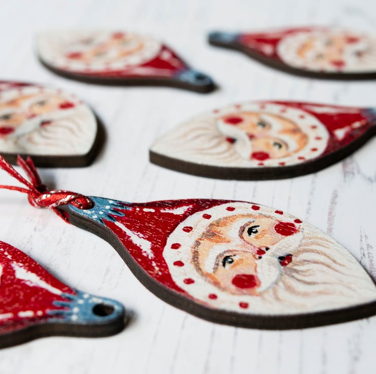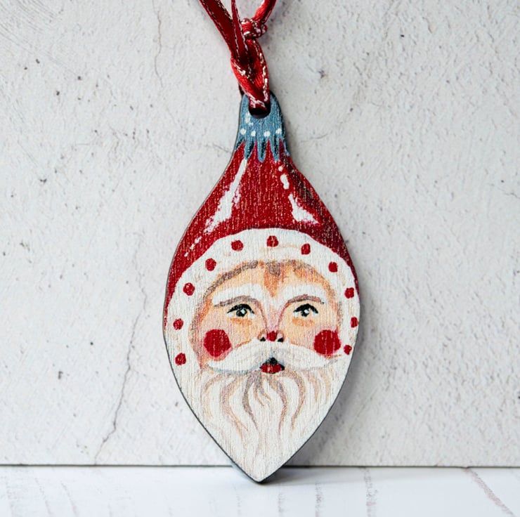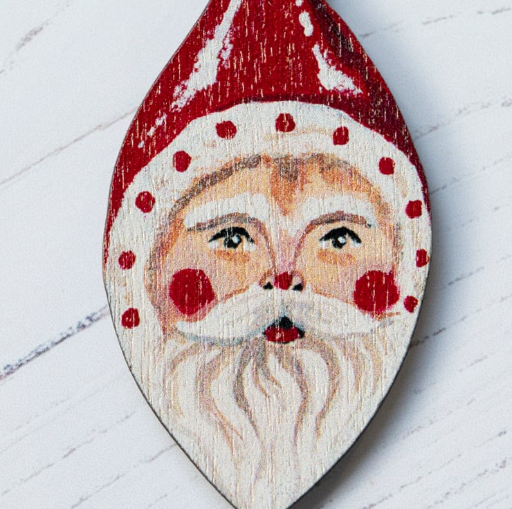 A double sided wooden hanging ornament featuring my illustration of a kitschy cute Father Christmas.