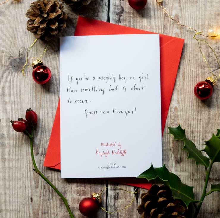 The card is blank inside and comes with a red envelope. The back of the card reads, "If you're a naughty boy or girl then something bad is about to occur. Gruss vom Krampus!"