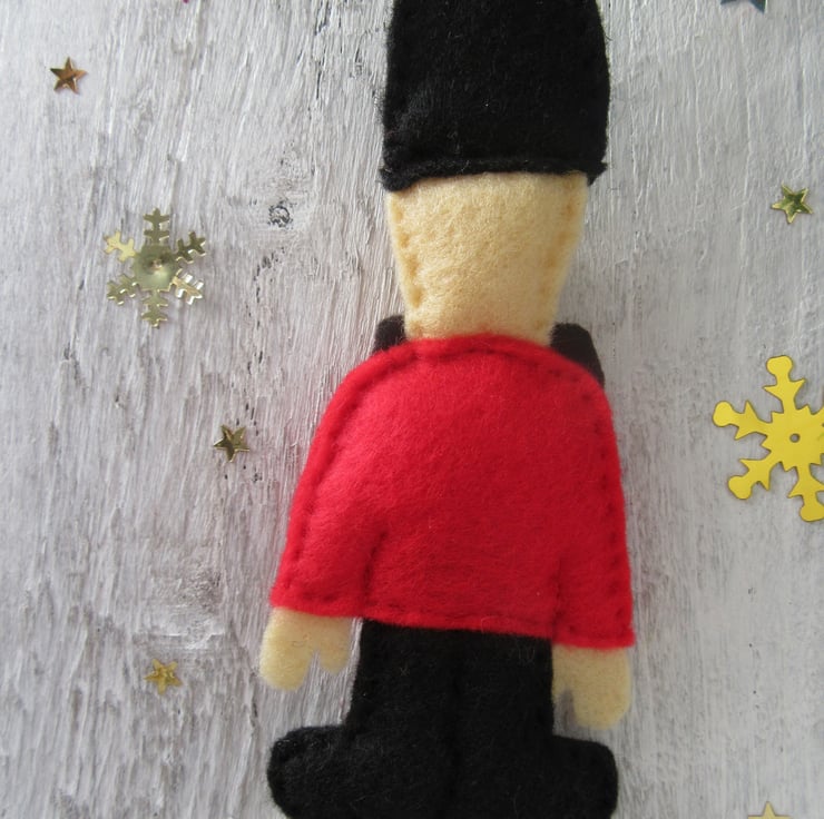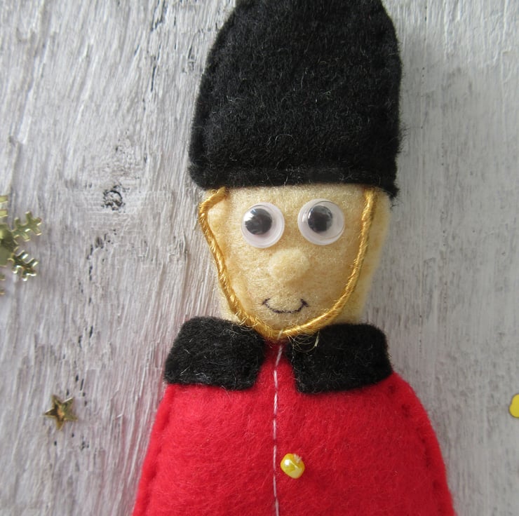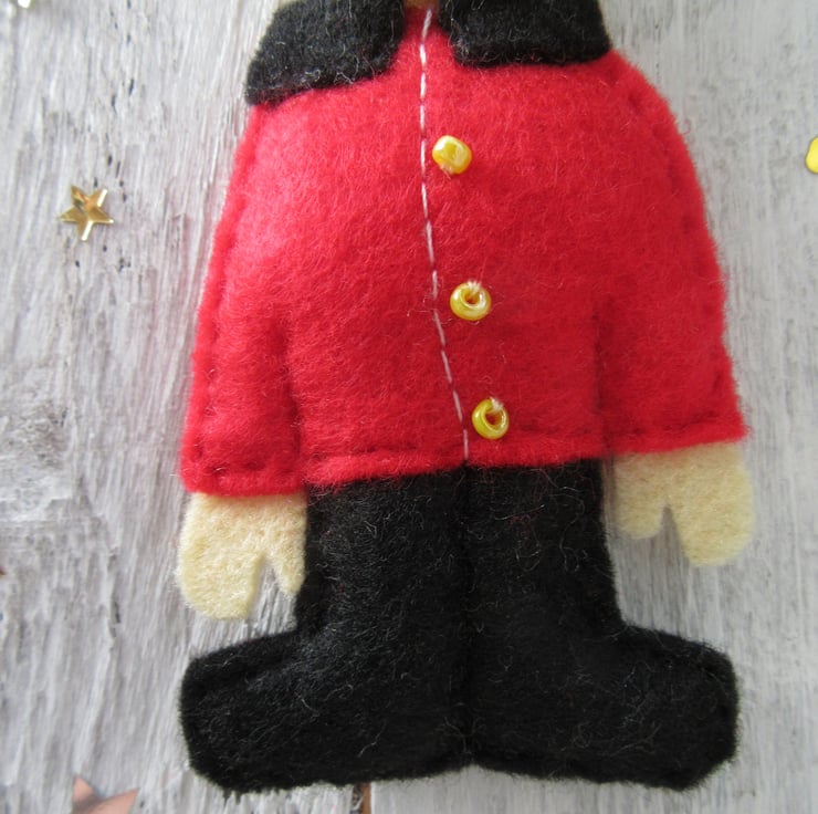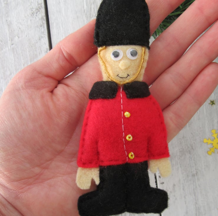 Felt hand stitched soldier Christmas tree decorations. Based on the guards outside Buckingham Palace.