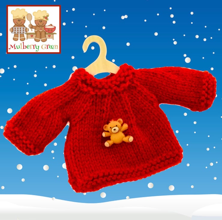 A lovely little red hand knitted jumper to fit the Mulberry Green characters. The jumper is decorated with a little teddy bear. It fastens with a little popper and comes on a little wooden hanger.