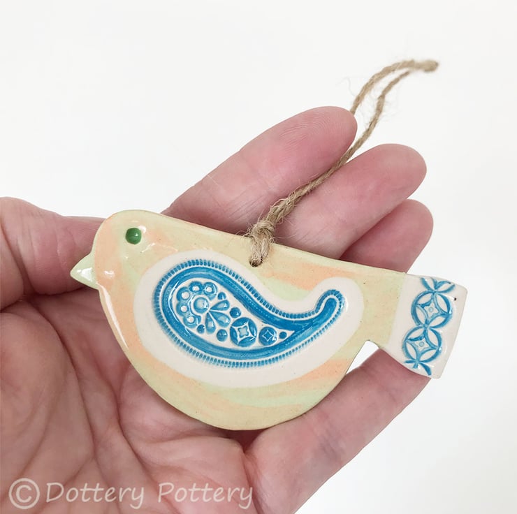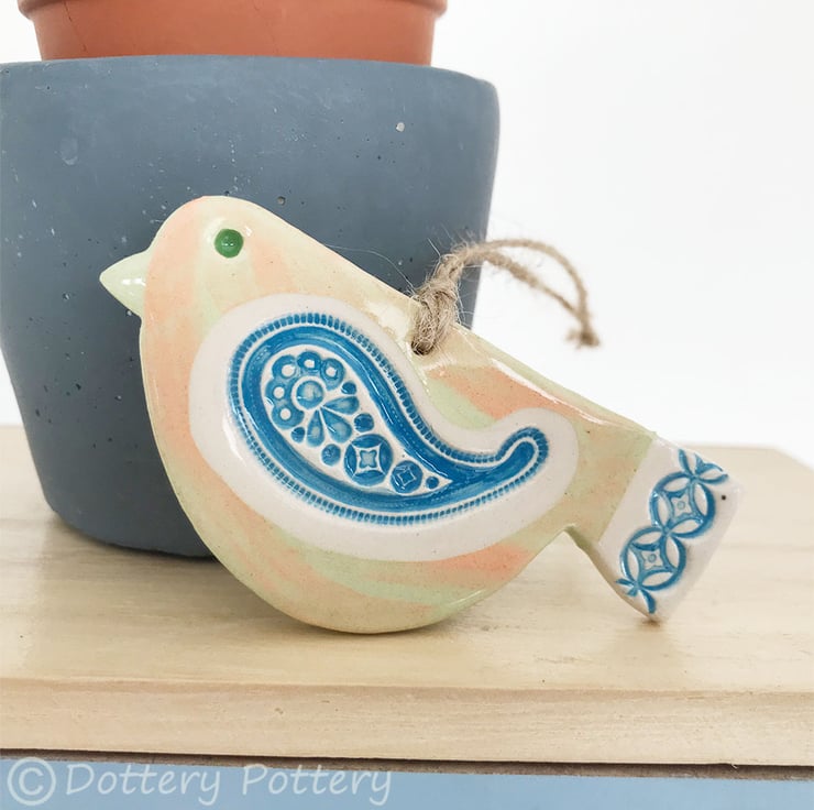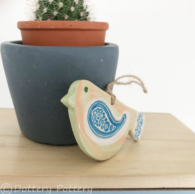 This cute little pottery bird has been hand-cut from a template that I designed myself.