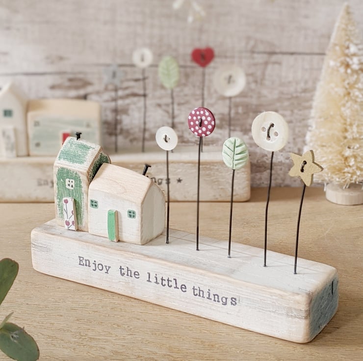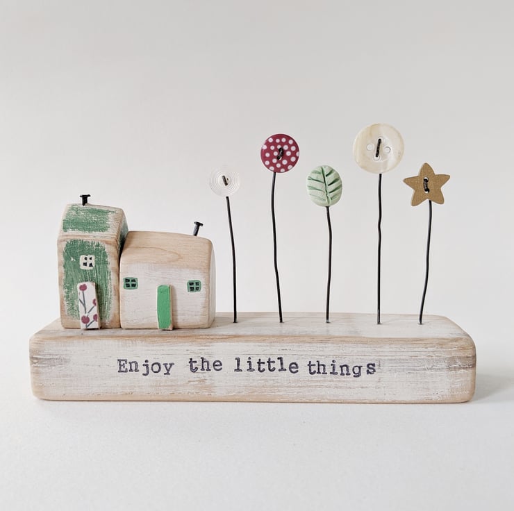 It sits on a painted and sanded block of wood, and on the front are the hand stamped words 'Enjoy the little things'.