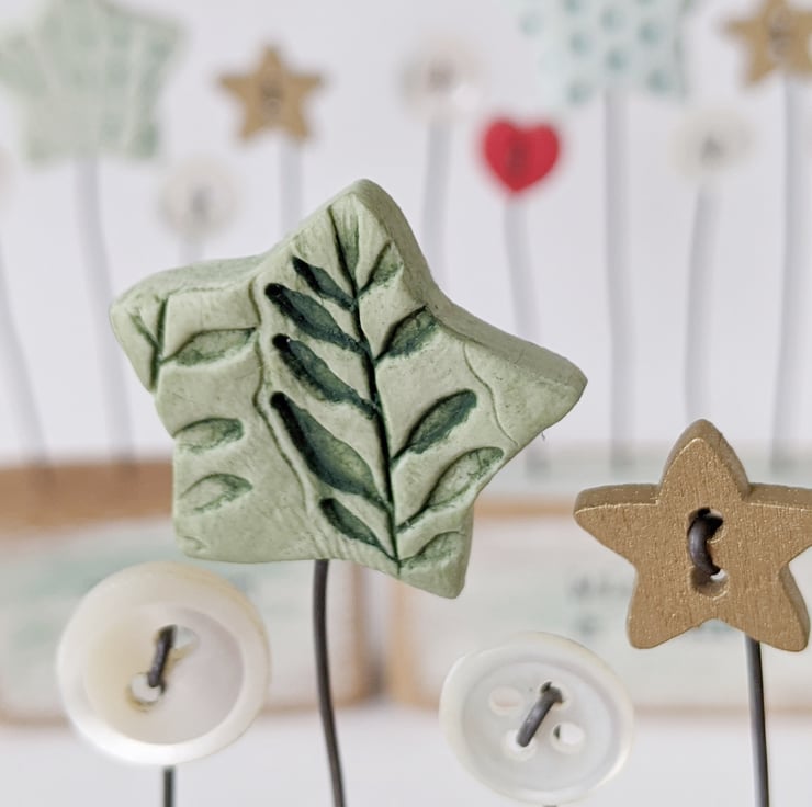 A clay star stands on a wire stalk in a painted wooden block.