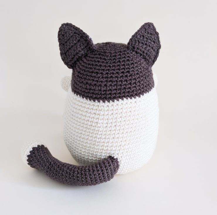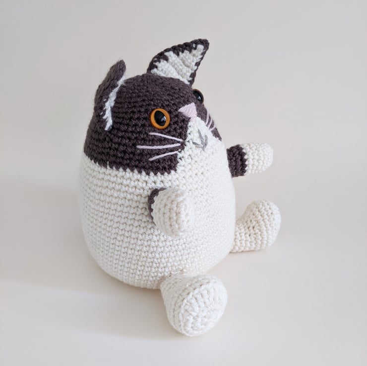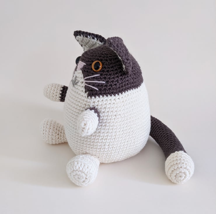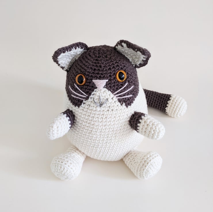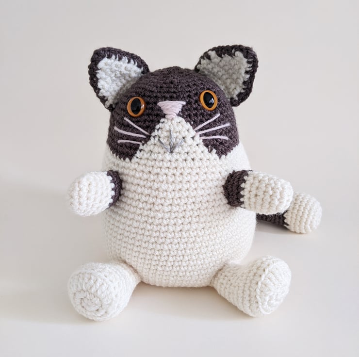 Crocheted from cream yarn with a brown head, it has orange safety eyes in a cat shape, embroidered nose, mouth and whiskers. This cat is guaranteed to make you smile, cute and practical all in one.