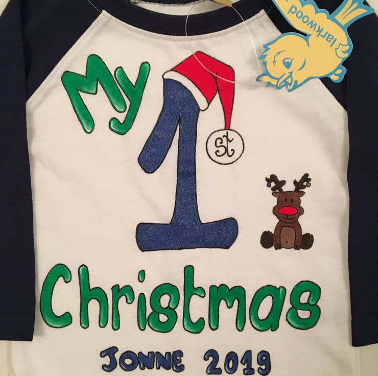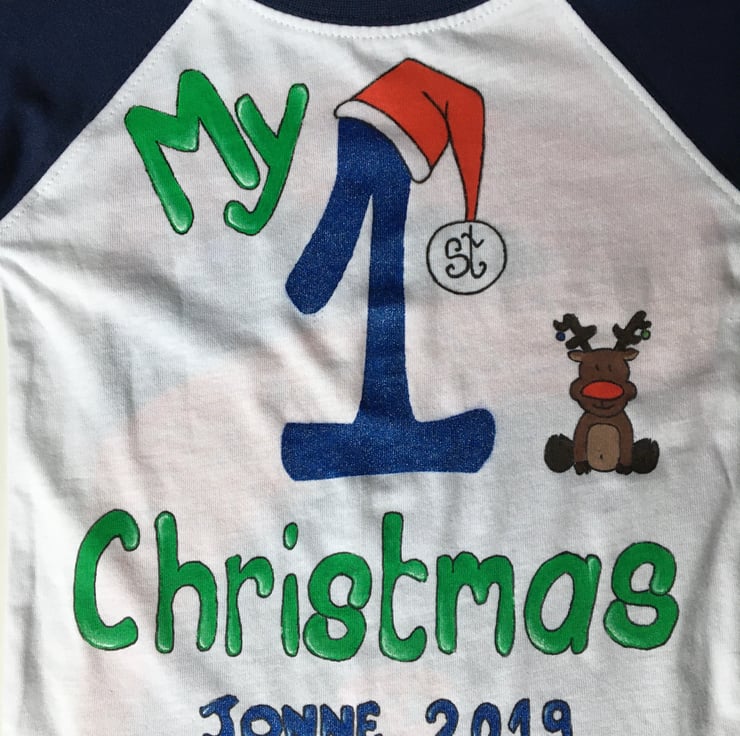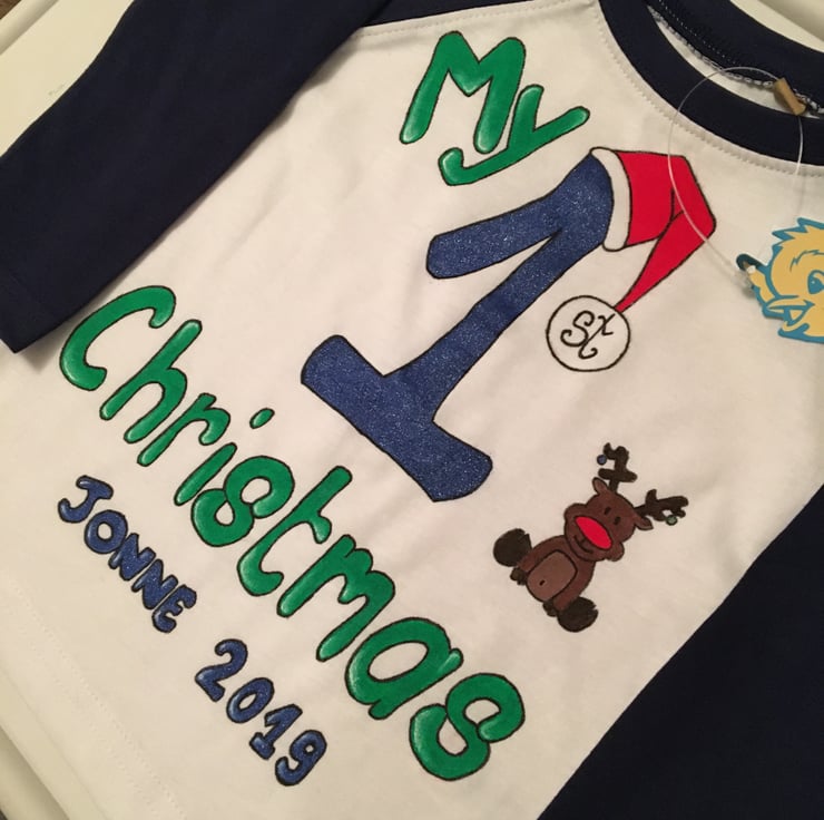Handpainted, personalised Christmas t-shirt. Designed for babies that are spending their first Christmas on Earth! Perfect as a gift, the tshirt can be kept forever as a keepsake.