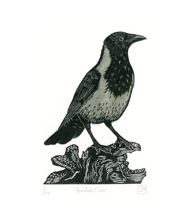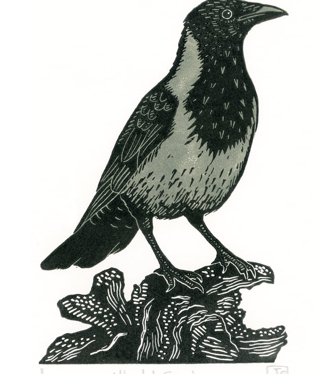 A 2-colour hand-printed linocut entitled 'Hooded Crow'.