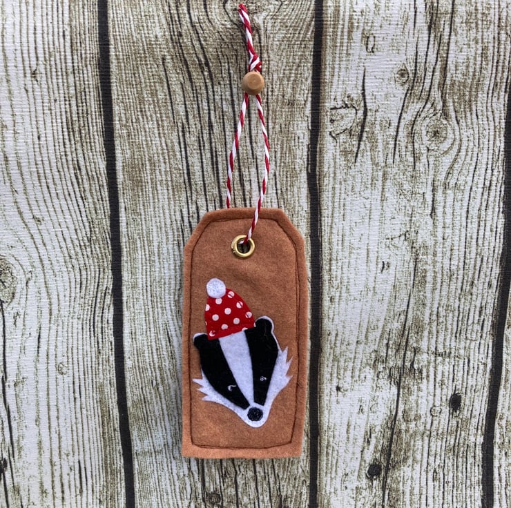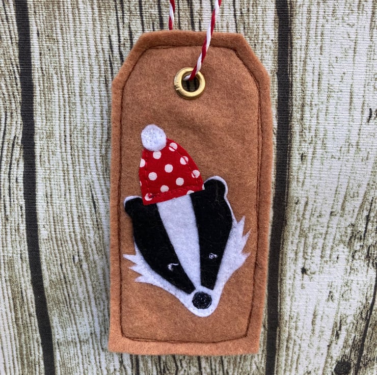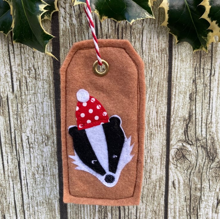 Hand made Christmas decoration featuring a Badger with a Christmas hat. The decoration is made using felt and cotton fabric, layered together and outlined with free motion embroidery. The approximate size is 6.5cm wide x 12cm long and comes with festive red & white string.