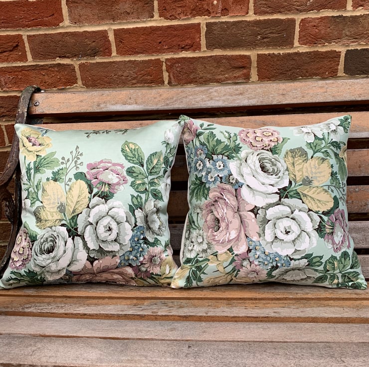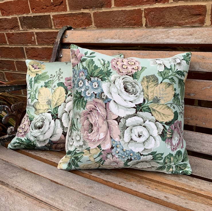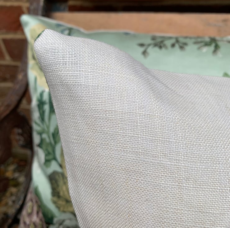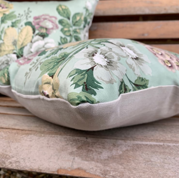 Square cushion cover in vintage Sanderson Knowle sateen fabric, reclaimed from a curtain. The cover is backed in cream linen.